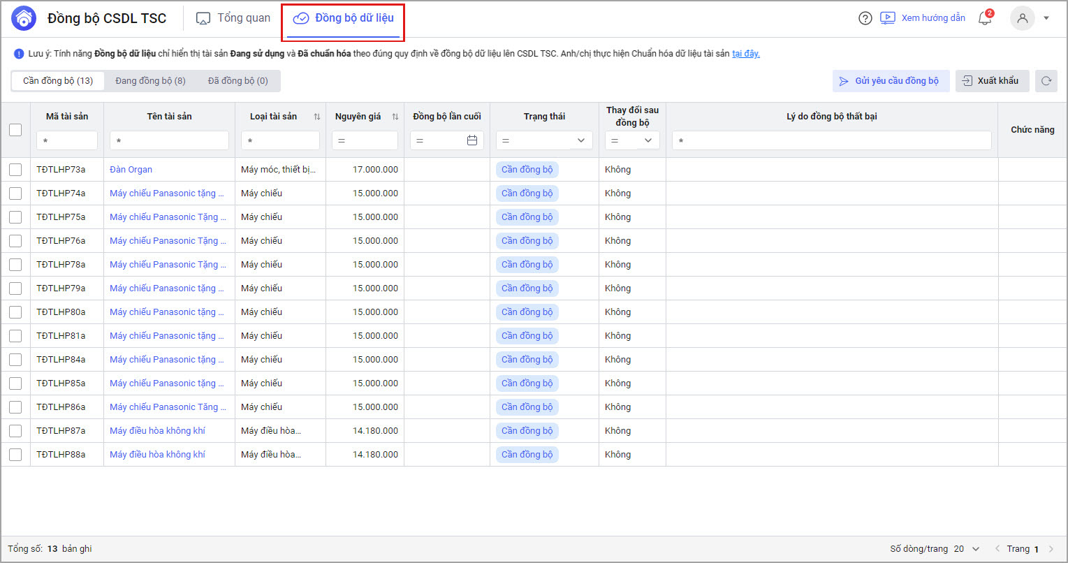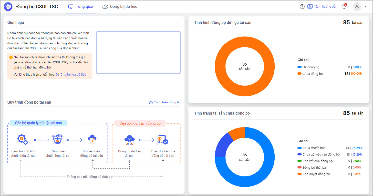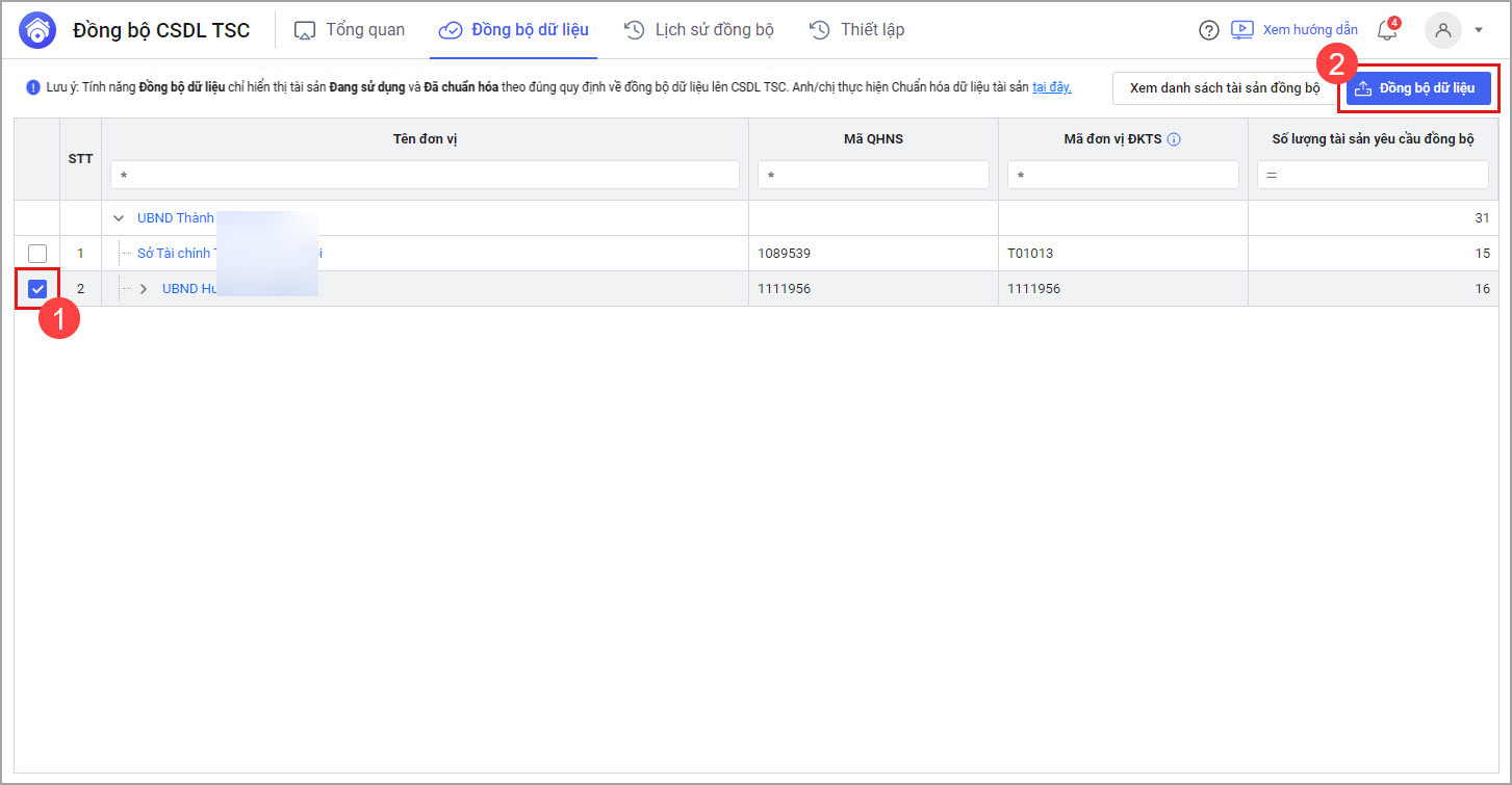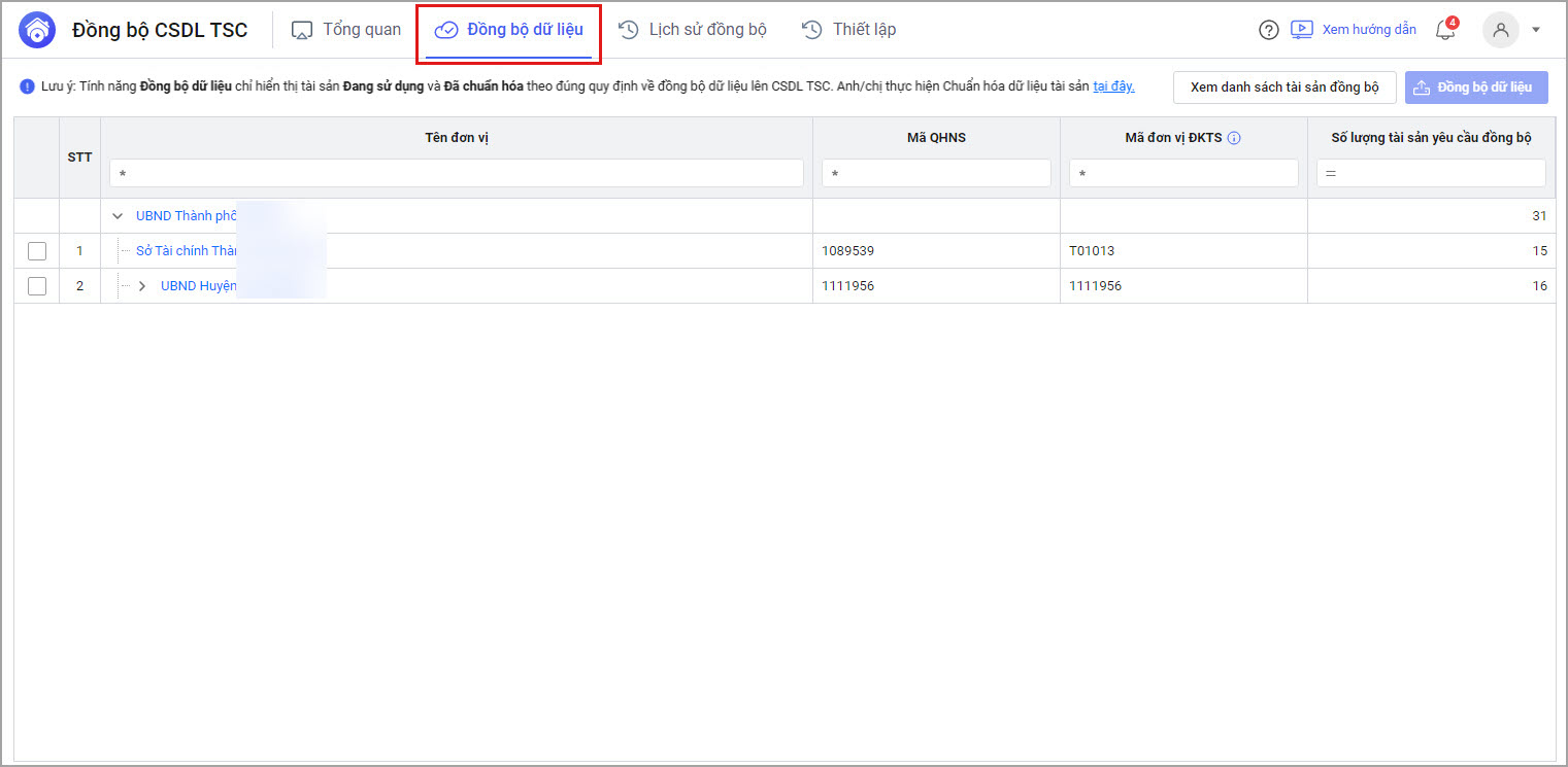Lưu ý: Trước khi tiến hành đồng bộ dữ liệu lên Cơ sở dữ liệu Quốc Gia, anh/chị đảm bảo đã kiểm tra và chuẩn hóa các thông tin của tài sản theo hướng dẫn chi tiết tại đây.