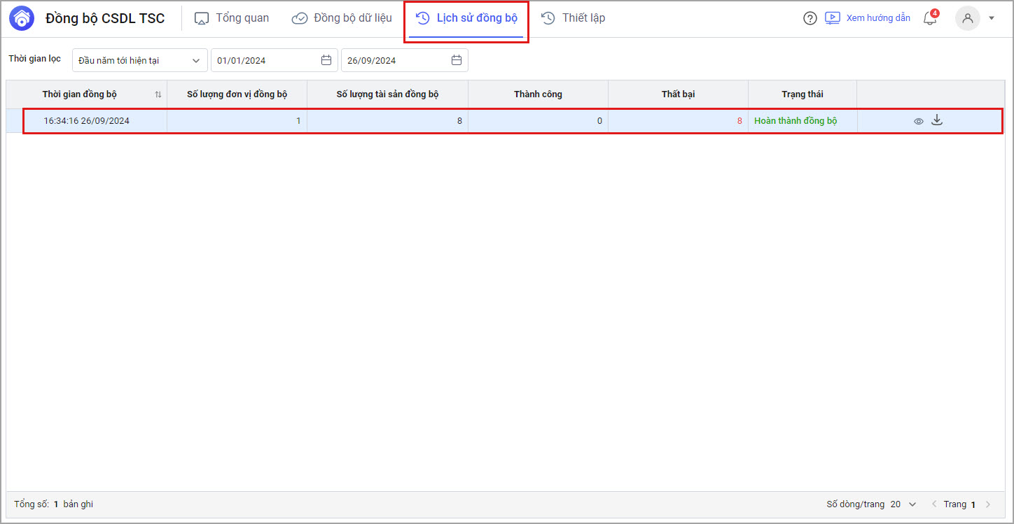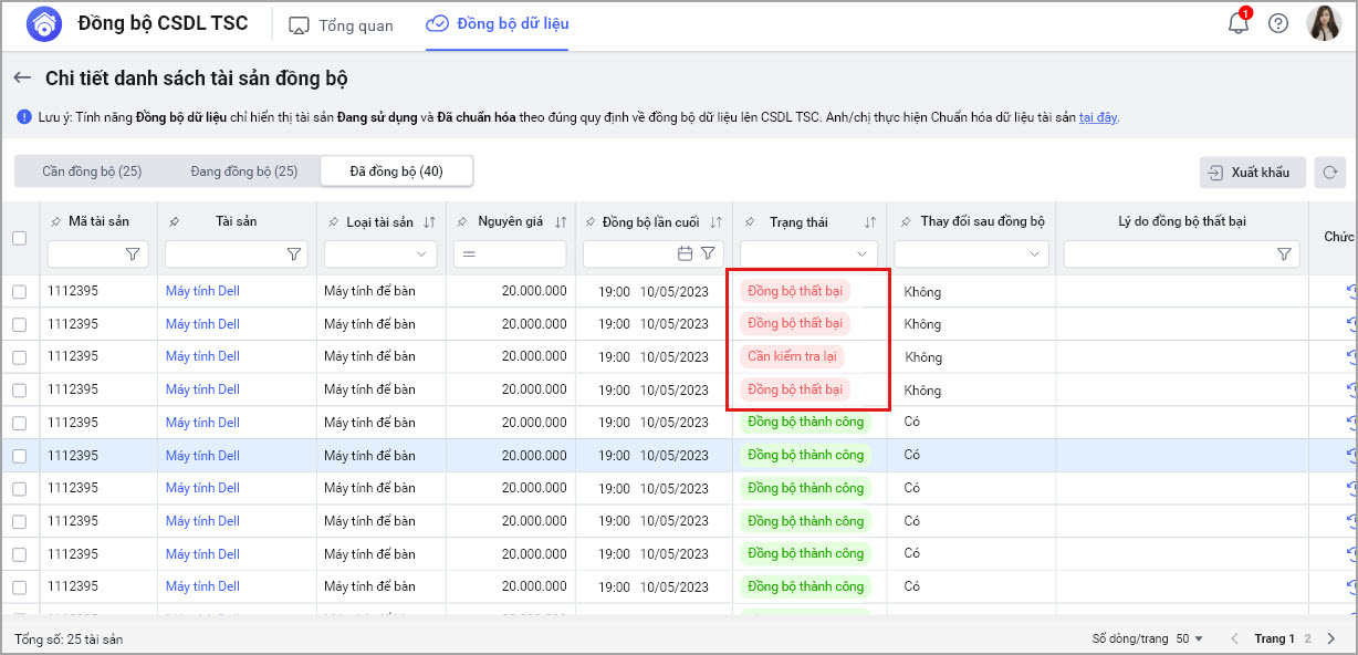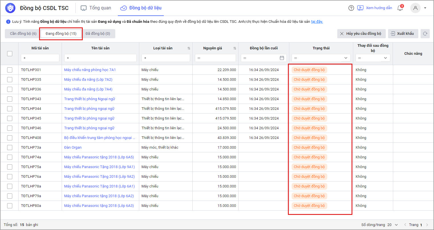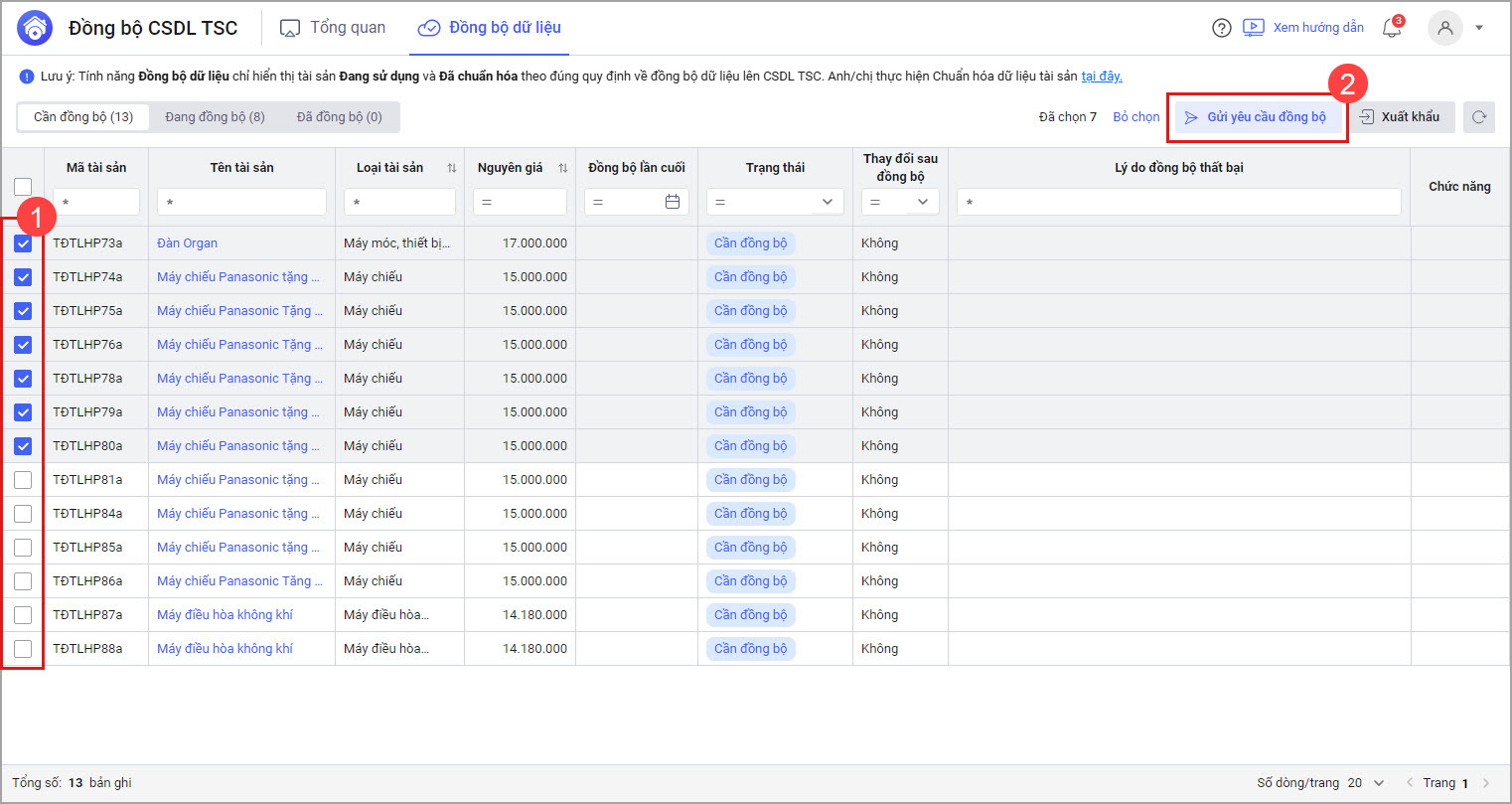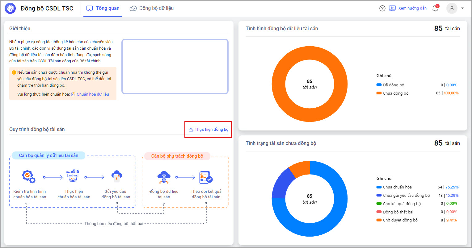 Lưu ý: Trước khi tiến hành đồng bộ dữ liệu lên Cơ sở dữ liệu Quốc Gia, anh/chị đảm bảo đã kiểm tra và chuẩn hóa các thông tin của tài sản theo hướng dẫn chi tiết tại đây.