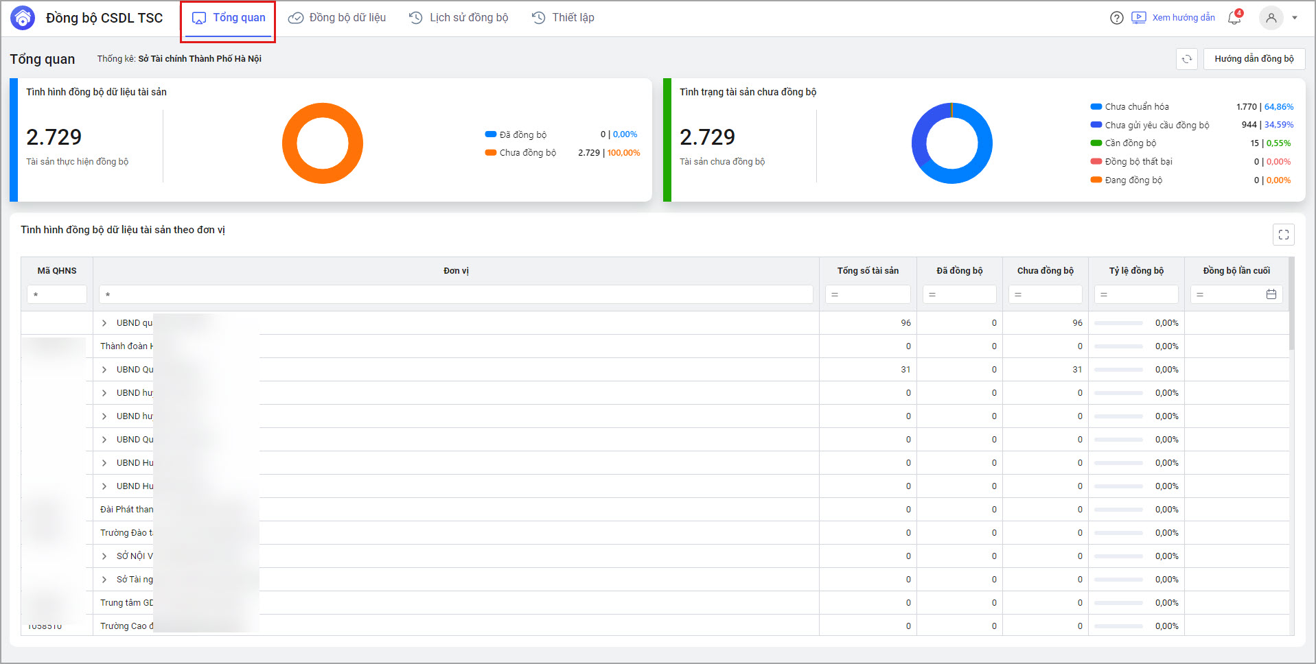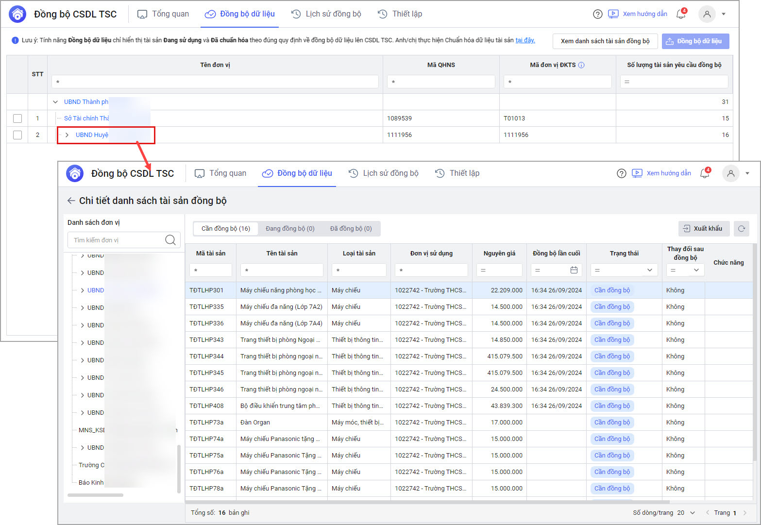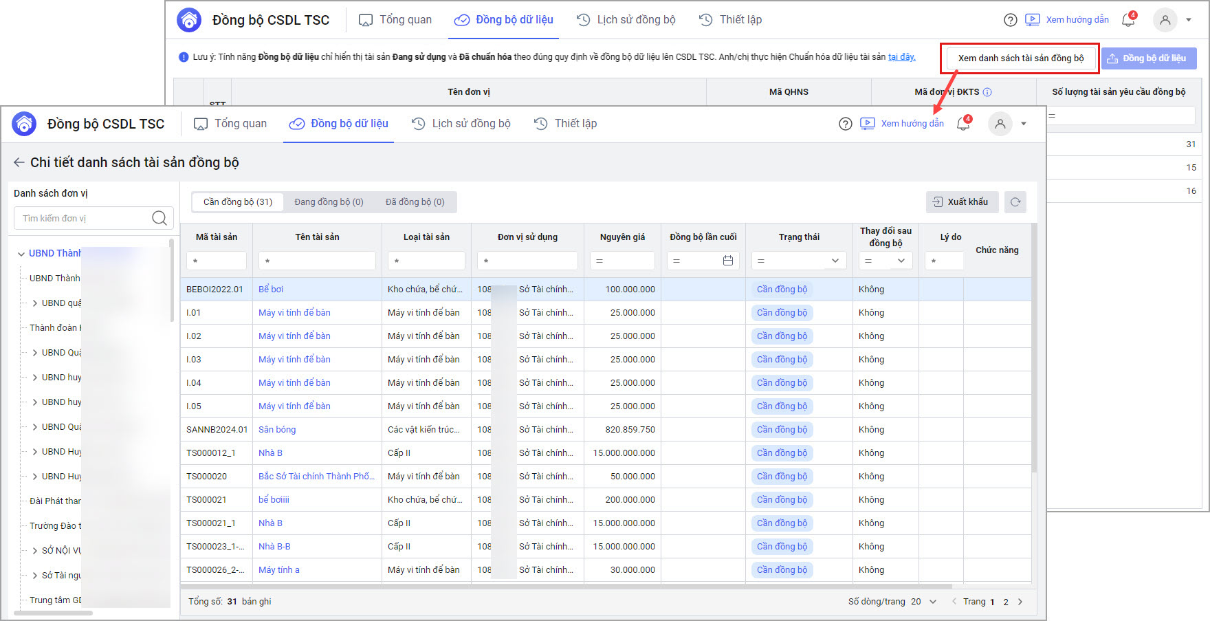 hoặc nếu muốn xem danh sách tài sản cụ thể tại đơn vị đã đồng bộ tài sản lên, anh/chị kích chuột vào đơn vị đấy.