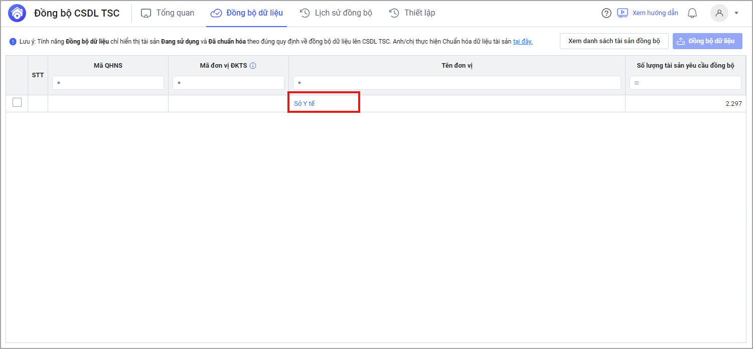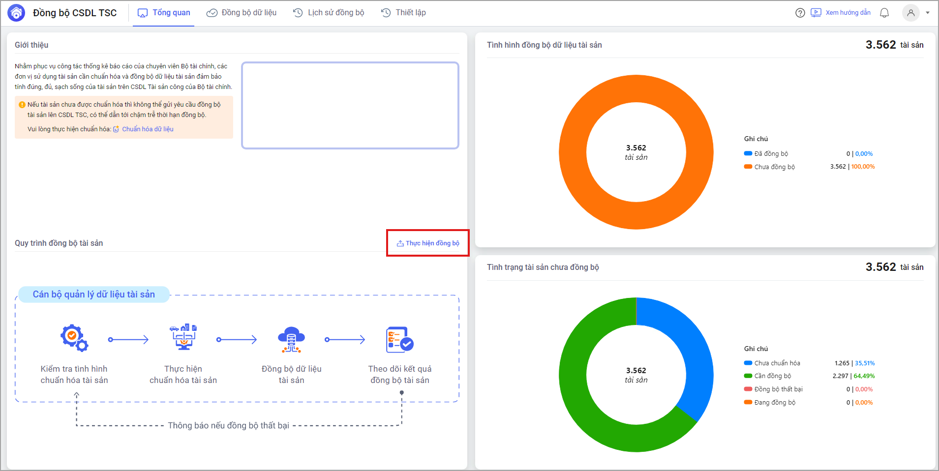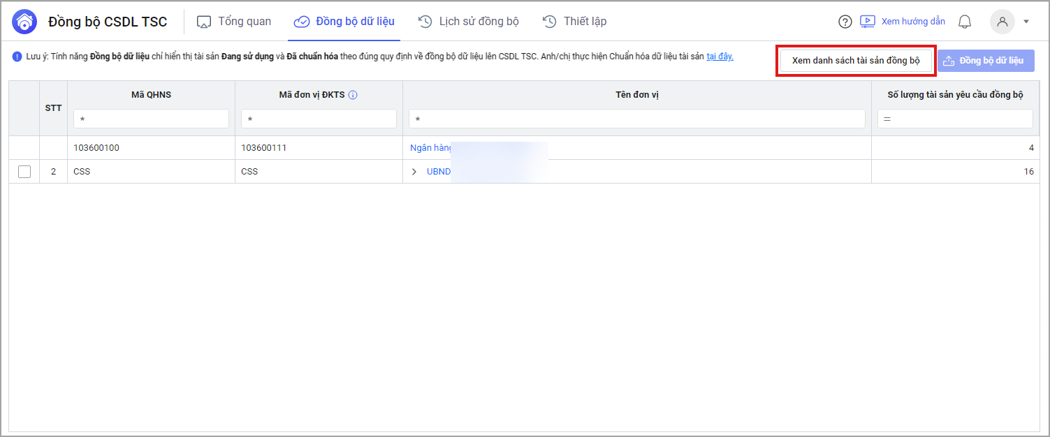 Lưu ý: Trước khi tiến hành đồng bộ dữ liệu lên CSDLQG, anh/chị đảm bảo đã kiểm tra và chuẩn hóa các thông tin của tài sản theo hướng dẫn chi tiết tại đây.