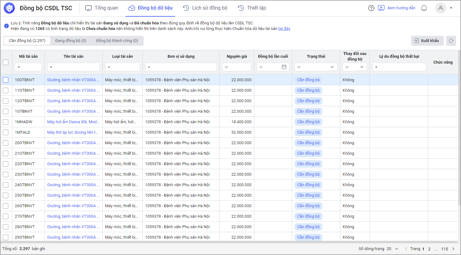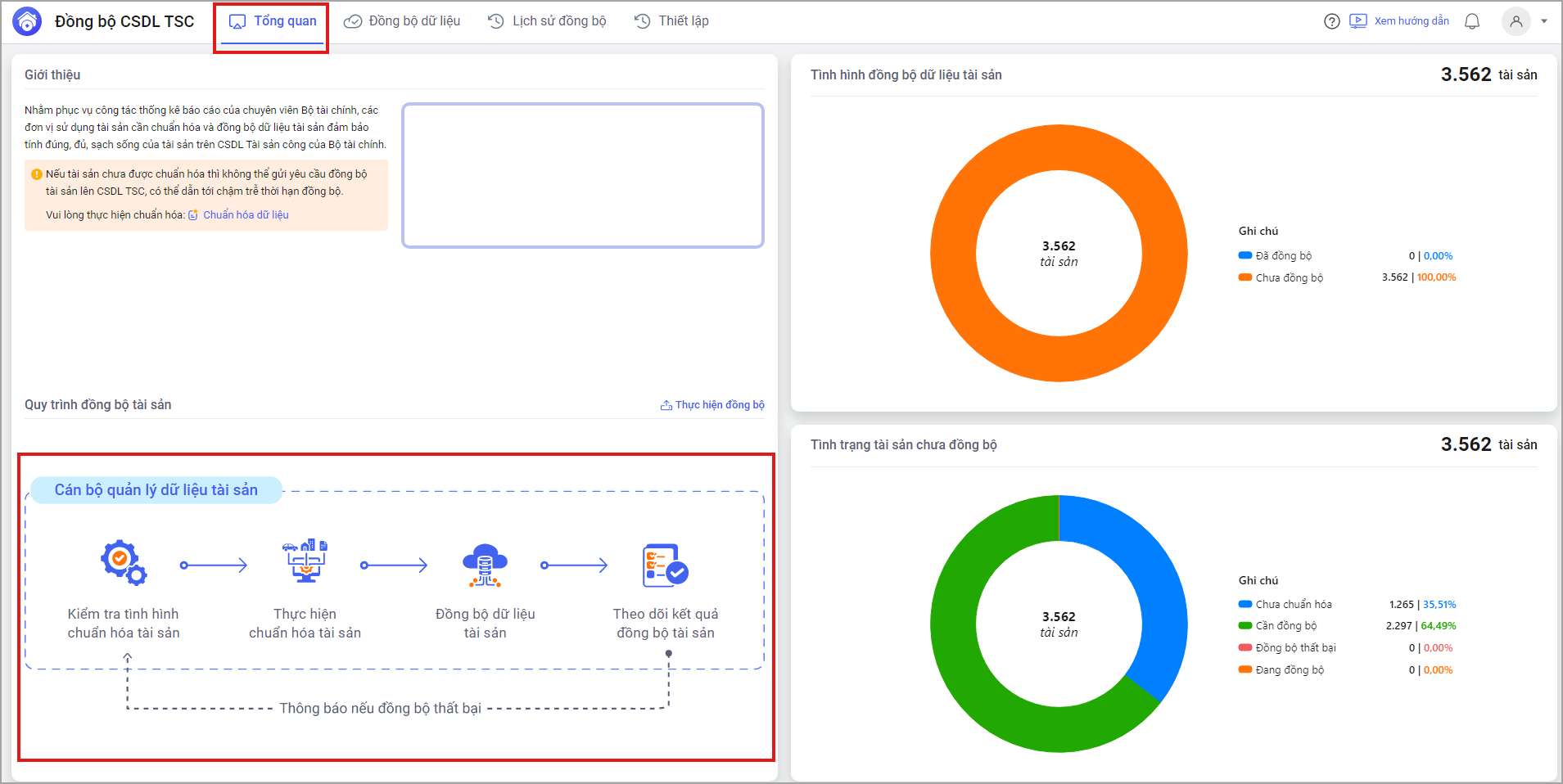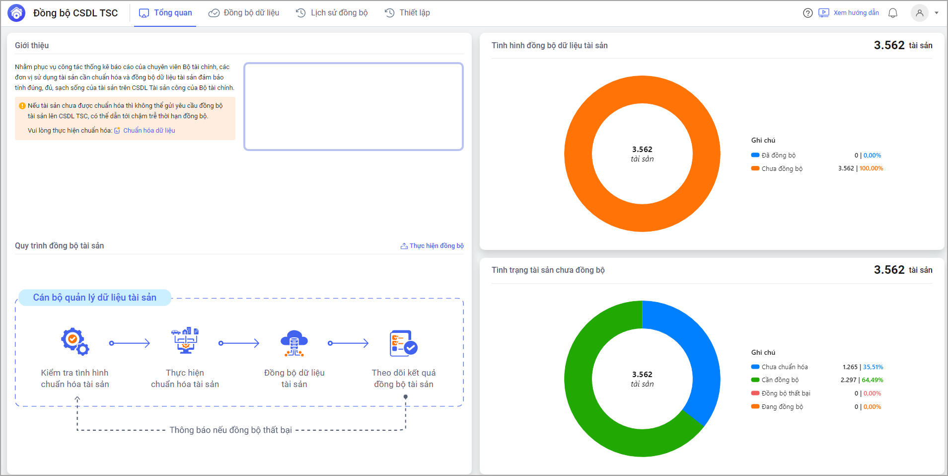 Lưu ý: Trước khi tiến hành đồng bộ dữ liệu lên CSDLQG, anh/chị đảm bảo đã kiểm tra và chuẩn hóa các thông tin của tài sản theo hướng dẫn chi tiết tại đây.