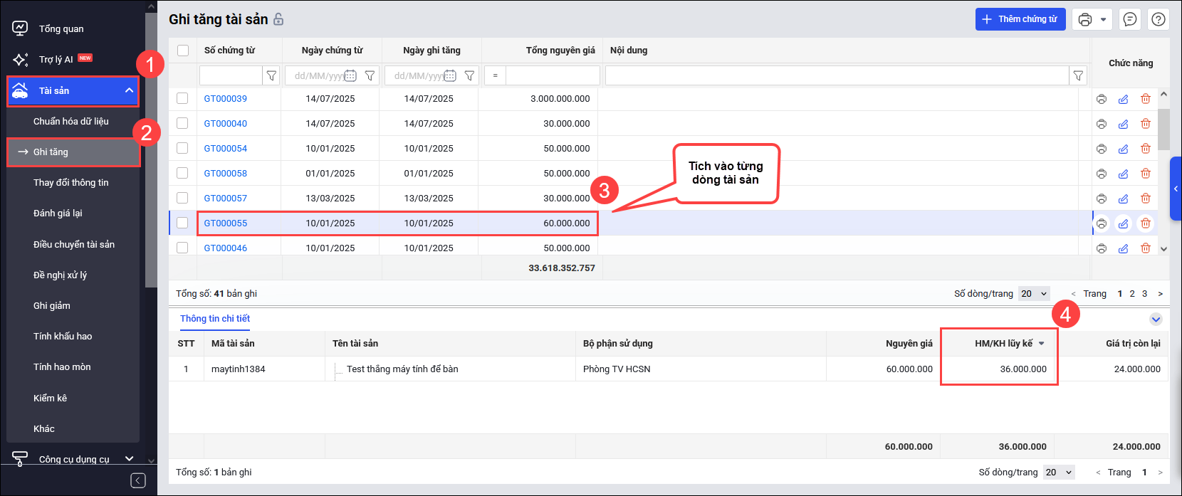 - Tích chọn từng tài sản. Sau đó nhìn xuống bên dưới phần Thông tin chi tiết, xem chỉ tiêu Hao mòn lũy kế (VND) và lấy giá trị tại cột Thay đổi (Chênh lệch).