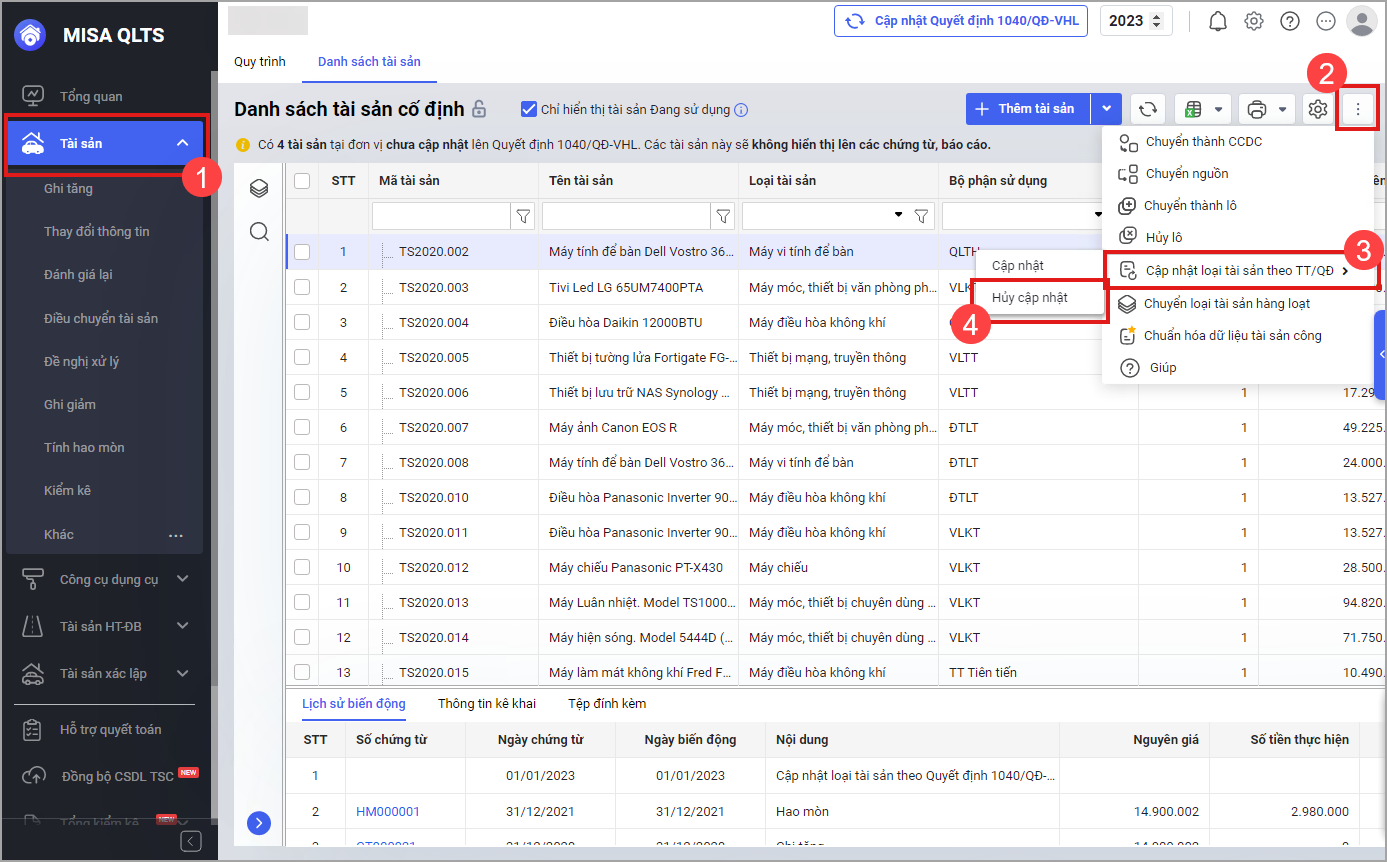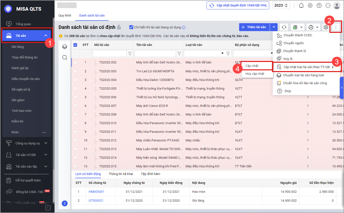 Bước 1: Tại màn hình Danh sách tài sản cố định nhấn vào biểu tượng dấu ba chấm, chọn Cập nhật loại tài sản theo TT/QĐ, sau đó chọn Cập nhật để cập nhật quyết định số 1040/QĐ-VHL