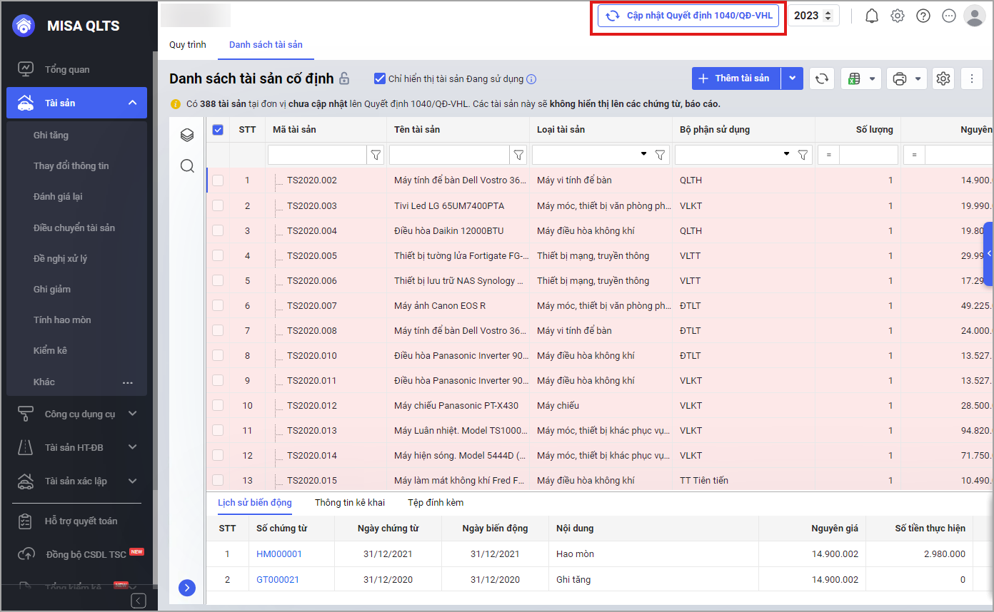 - Hoặc tại màn hình Danh sách tài sản cố định chọn Cập nhật quyết định số 1040/QĐ-VHL