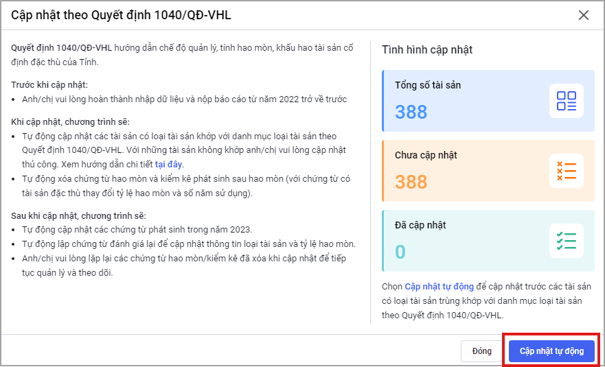 Kể từ phiên bản R50: Bổ sung thêm chức năng Cập nhật quyết định số 1040/QĐ-VHL của Viện Hàn Lâm để anh/chị có thể cập nhật danh mục tài sản theo quyết định này.