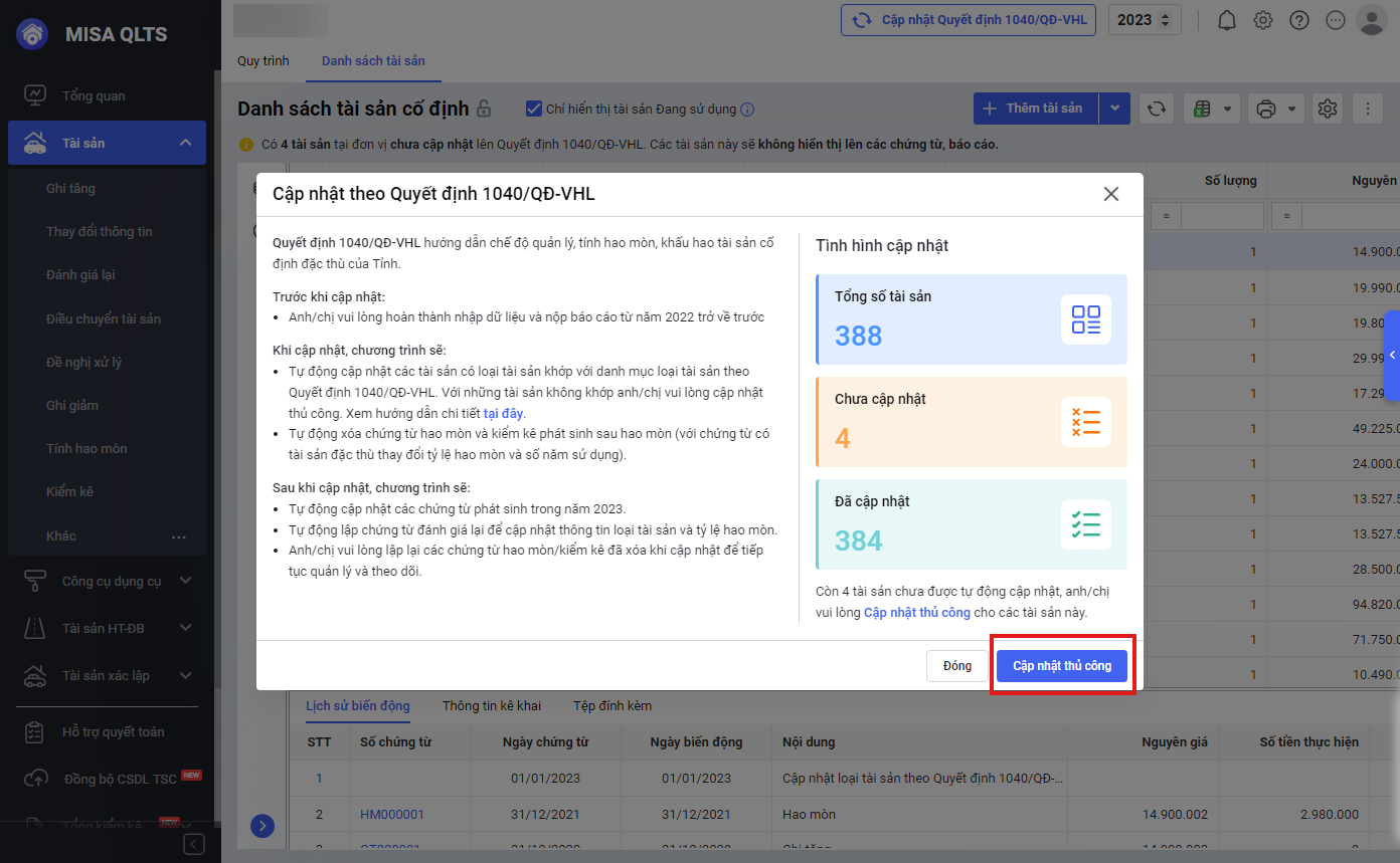 Bước 3: Phần mềm hiển thị tổng số tài sản đã cập nhật, tổng số tài sản chưa được cập nhật. Với các tài sản chưa được cập nhật anh/chị có thể cập nhật thủ công bằng cách chọn Cập nhật thủ công anh/chị xem hướng dẫn Cập nhật thủ công tương tự tại đây