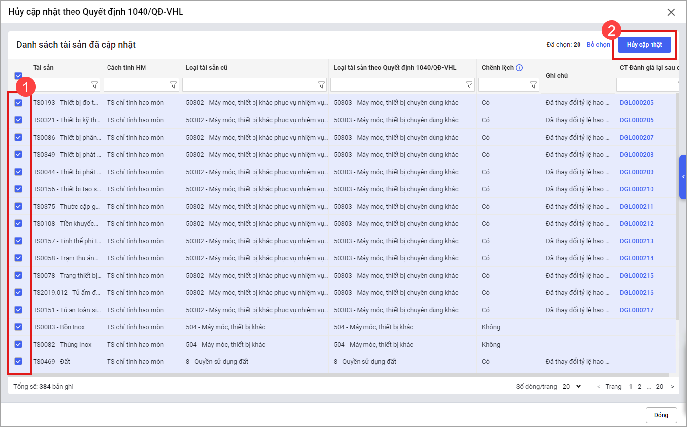 - Phần mềm sẽ hiển thị lên danh sách hủy chuyển đổi. Tích chọn tài sản và nhấn Hủy cập nhật.