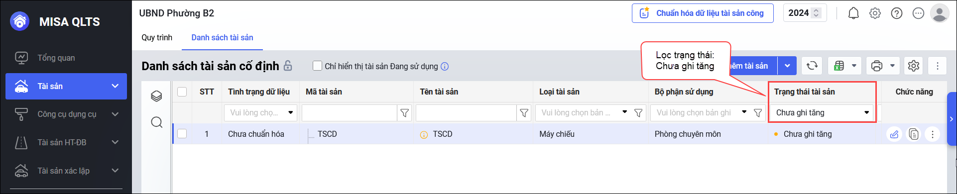 Bước 1: Vào Tài sản, tại Danh sách tài sản cố định, tại cột Trạng thái tài sản, lọc loại Chưa ghi tăng.