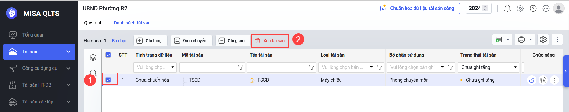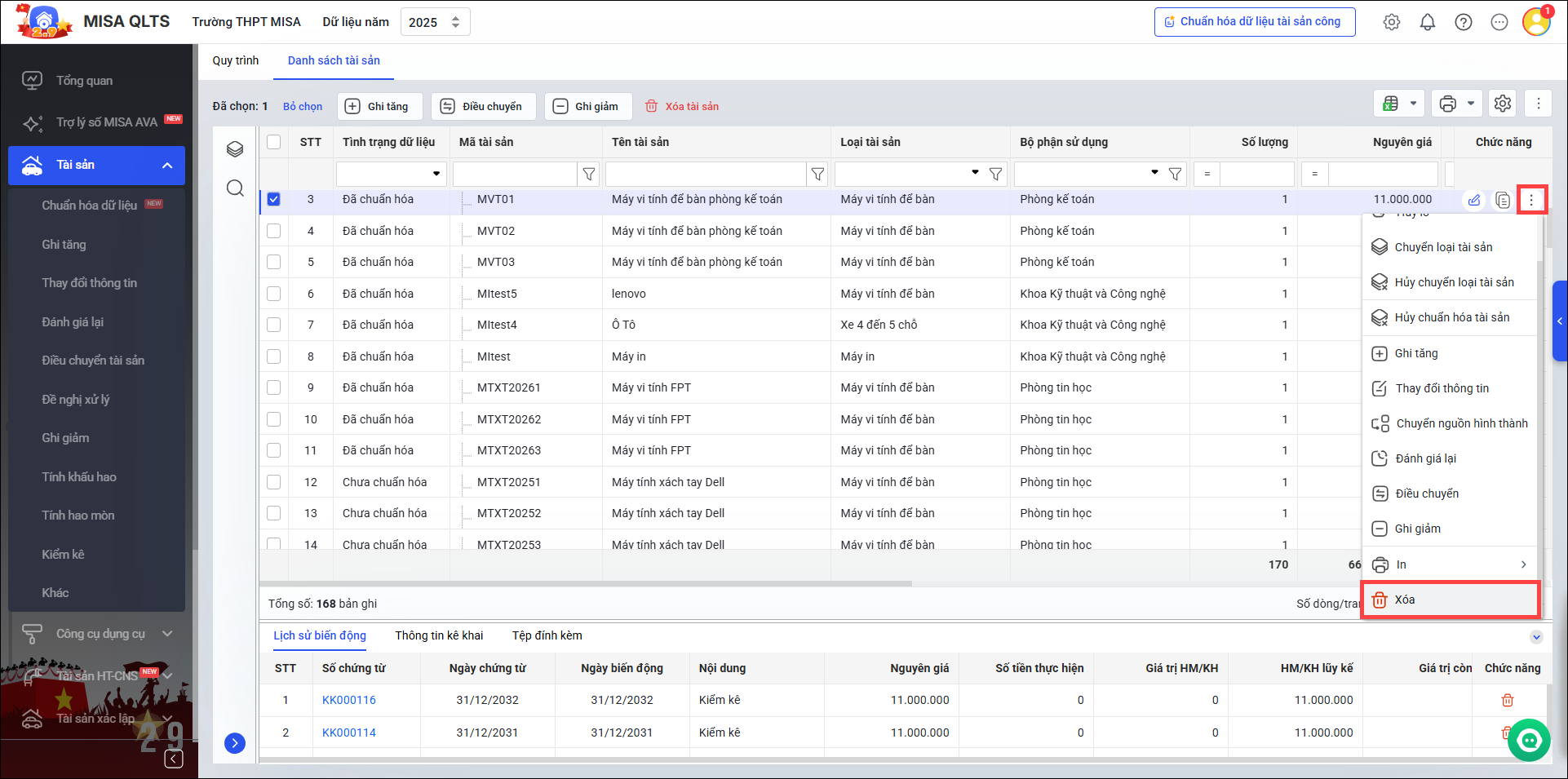 Bước 2: Tích 1 lần chuột trái vào tài sản cần xóa, nhấn vào dấu 3 chấm cuối dòng tài sản, chọn Xóa.