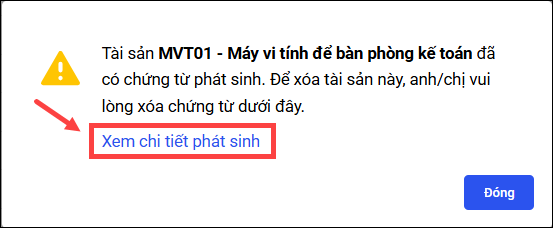 • Phần mềm hiển thị cảnh báo đã có chứng từ phát sinh, nhấn Xem chi tiết phát sinh để biết các chứng từ phát sinh.
