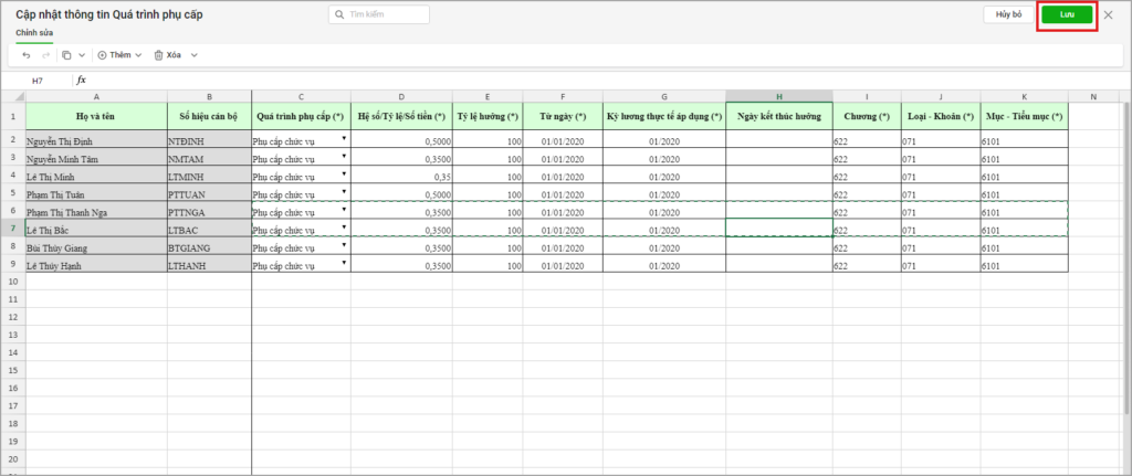 - Chương trình hiển thị thông tin CBNV đã khai báo trước đó, anh/chị thay đổi thông tin mới cho CBNV tương tự như thao tác trên file excel, sau đó chọn Lưu