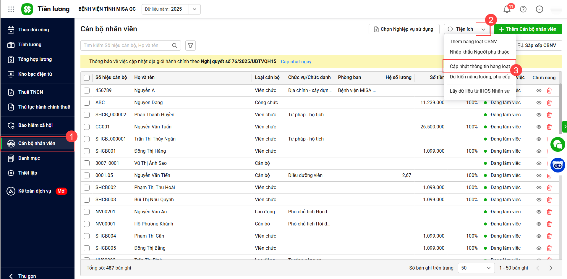 - Chọn Tiện ích\Cập nhật thông tin hàng loạt để cập nhật thông tin cho toàn bộ CBNV hoặc tùy chọn CBNV