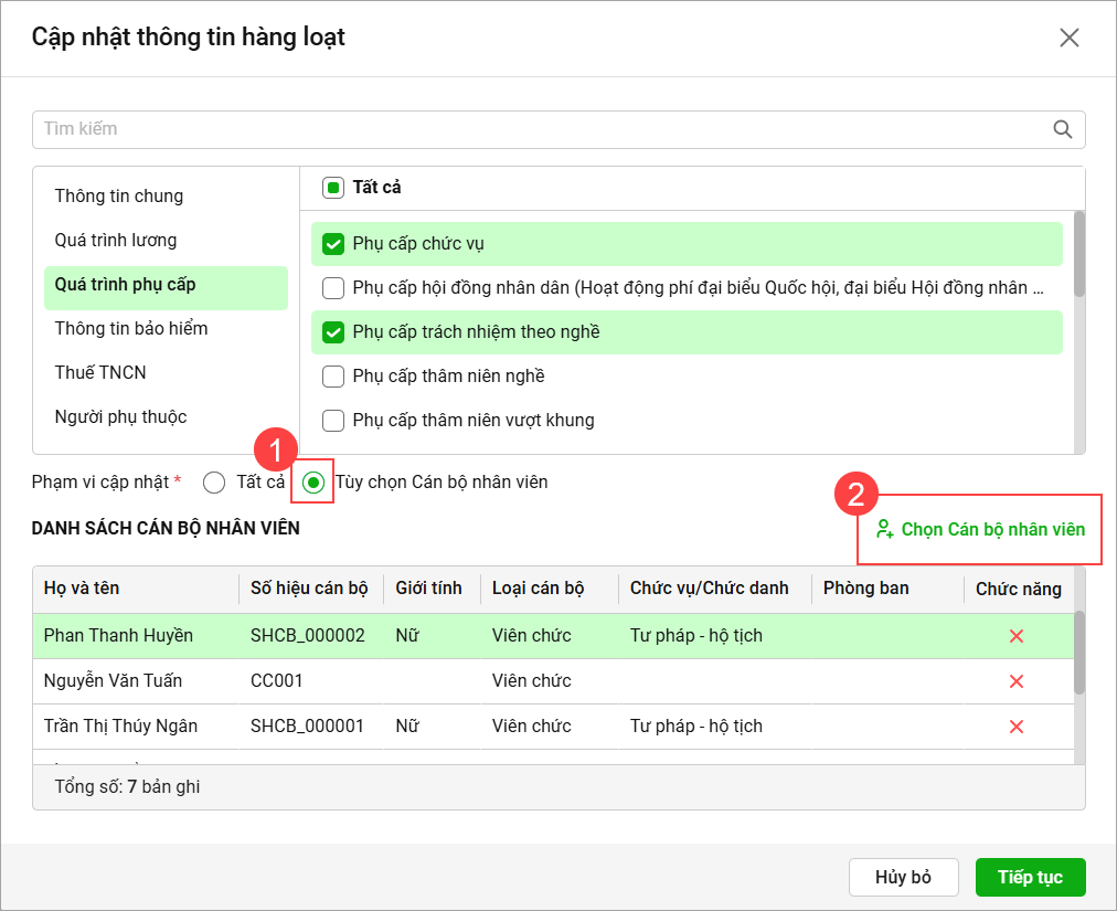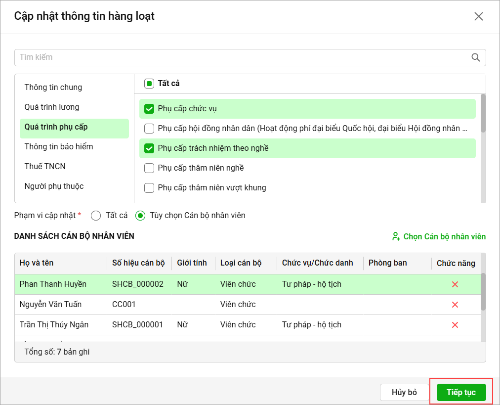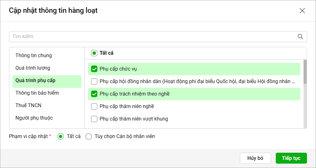- Chọn Phạm vi cập nhật tương ứng, nếu chỉ có 1 vài CBNV được cập nhật thông tin này anh/chị tích chọn Tùy chọn Cán bộ nhân viên và tích chọn CBNV tương ứng