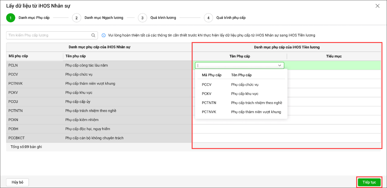- Chọn danh mục Phụ cấp và Tiểu mục tương ứng trên iHOS Tiền lương để ghép với danh mục Phụ cấp trên iHOS Nhân sự.