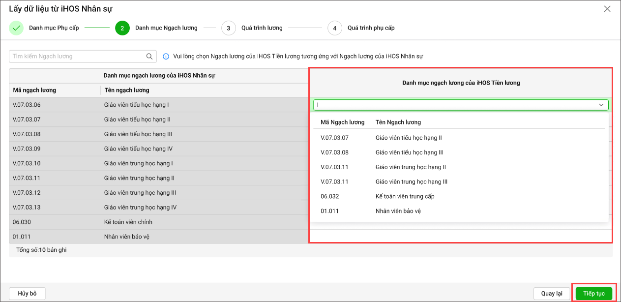 - Chọn danh mục Ngạch lương trên iHOS Tiền lương để ghép với Ngạch lương trên iHOS Hệ thống.