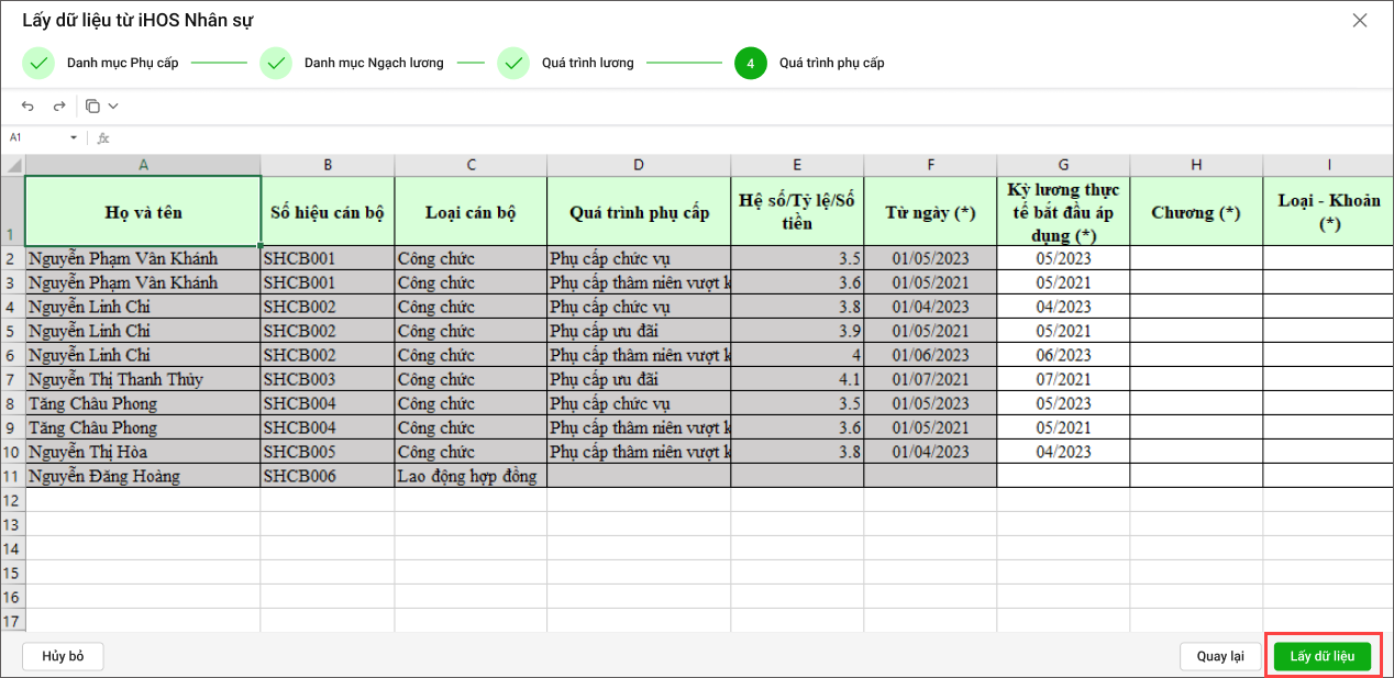 - Kiểm tra lại danh sách cán bộ kèm quá trình phụ cấp tương ứng từ iHOS Nhân sự.