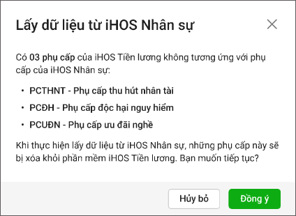 *Lưu ý: Nếu trên iHOS Tiền lương còn phụ cấp nào mà anh/chị chưa ghép với phụ cấp trên iHOS Nhân sự, thì sau khi nhấn Đồng ý, các phụ cấp đó sẽ bị xóa khỏi iHOS Tiền lương.