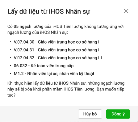*Lưu ý: Nếu trên iHOS Tiền lương còn ngạch lương nào mà anh/chị chưa ghép với ngạch lương trên iHOS Nhân sự, thì sau khi nhấn Đồng ý, các ngạch lương đó sẽ bị xóa khỏi iHOS Tiền lương.