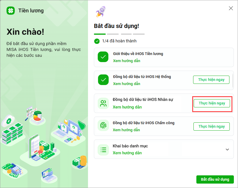 1. Trên giao diện Bắt đầu sử dụng, nhấn Thực hiện ngay tại chức năng Đồng bộ dữ liệu từ iHOS Nhân sự.