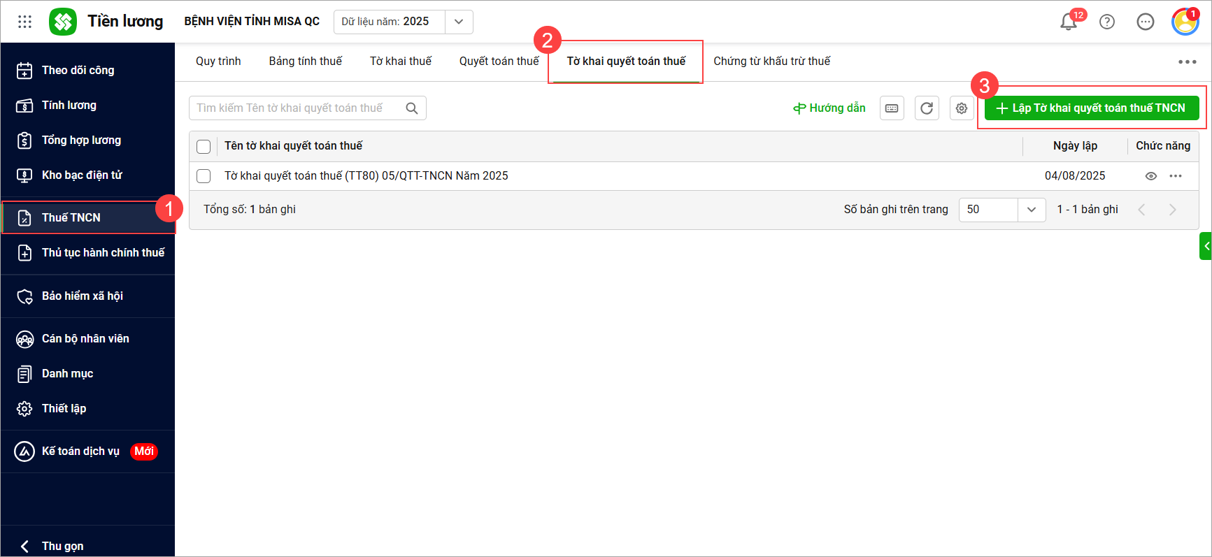 1. Anh/chị vào menu Thuế TNCN\Tờ khai quyết toán thuế\Lập Tờ khai quyết toán thuế TNCN