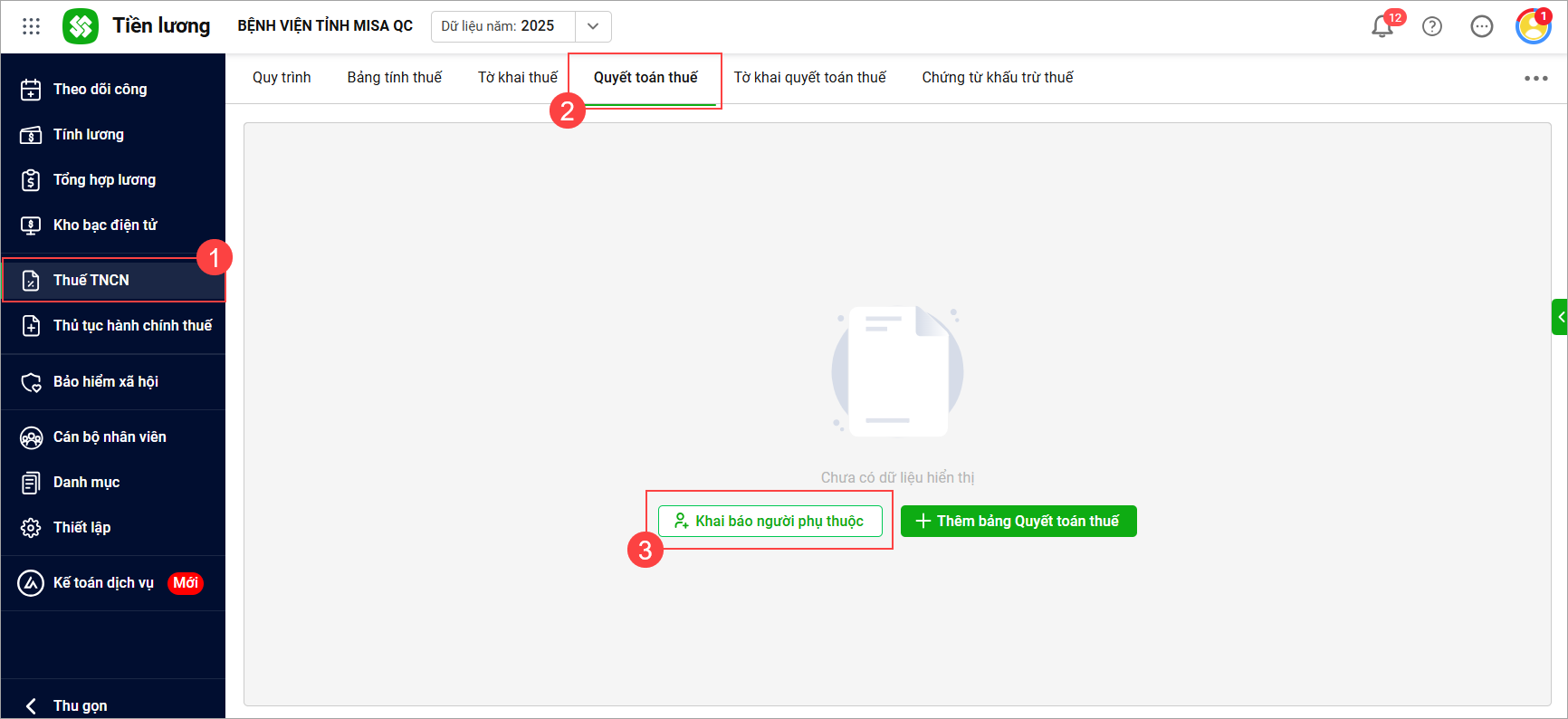 1. Vào menu Thuế TNCN\Quyết toán thuế\Khai báo người phụ thuộc để cập nhật hàng loạt 2. Chọn CBNV có ủy quyền quyết toán thuế để khai báo thông tin người phụ thuộc3. Tích chọn CBNV, nhấn Đồng ý4. Chọn Đồng ý5. Anh/chị kiểm tra thông tin người phụ thuộc của CBNV, bổ sung thông tin NPT cho những CBNV còn thiếu. chọn Lưu