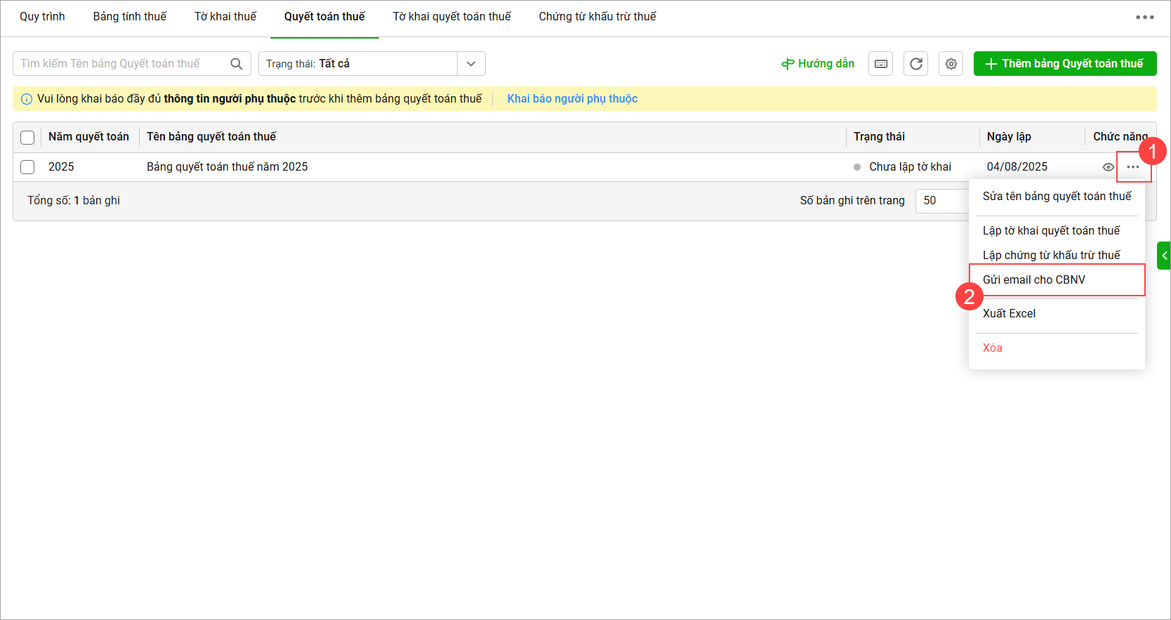 Thông tin định danh CBNV, thuế suất, CBNV đó có ủy quyền quyết toán thuế hay không, Tổng thu nhập chịu thuế lấy từ các bảng tính, Thông tin các khoản giảm trừ, số thuế đã nộp trong 12 tháng, số thuế nộp thừa, số thuế cần phải nộp thêm, ….4. Anh/chị kiểm tra lại thông tin bảng tính nếu muốn sửa lại số liệu anh/chị sửa trực tiếp vào bảng tính, sau đó chọn Lưu.5. Sau khi lập bảng quyết toán thuế, để gửi cho CBNV tự đối chiếu, kiểm tra, tại màn hình bảng Quyết toán thuế, chọn Gửi email cho CBNV6. Nhập thông tin email CBNV, chọn Tiếp tục 7. Điền nội dung emai sẽ gửi đến cho CBNV, chọn GửiLưu ý: Có thể chọn Xem trước để xem nội dung thông báo quyết toán thuế cho CBNV