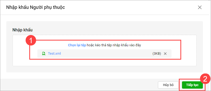 - Chọn tệp XML để nhập khẩu thông tin người phụ thuộc lên phần mềm, chọn Tiếp tục
