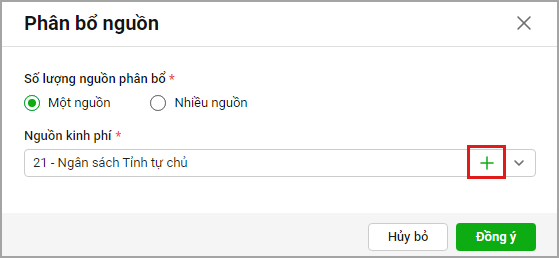 - Trường hợp không tìm thấy nguồn kinh phí muốn sử dụng anh/chị chọn biểu tượng dấu cộng để thêm nhanh