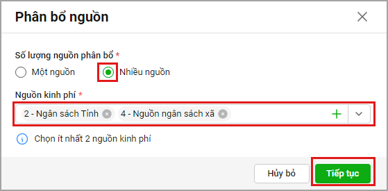 3. Trường hợp đơn vị sử dụng 2 nguồn kinh phí trở lên để chi trả lương, anh/chị tích chọn Nhiều nguồn và chọn nguồn chi trả tương ứng. Anh/chị chọn Tiếp tục để xác định tiêu chí phân bổ.