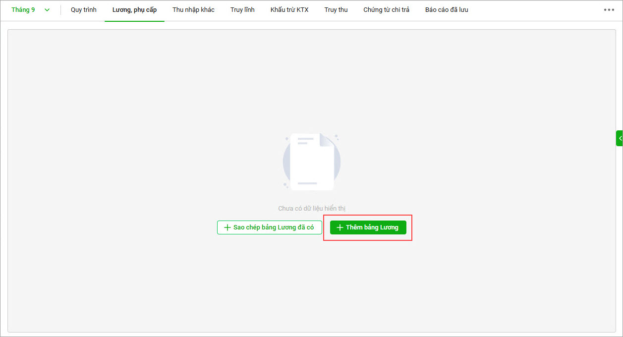 2. Chọn Thêm Bảng lương để phần mềm tự động tổng hợp số liệu của bảng lương dựa trên danh sách CBNV, phòng ban, bảng tổng hợp công (nếu có) anh/chị đã khai báo trước đó.