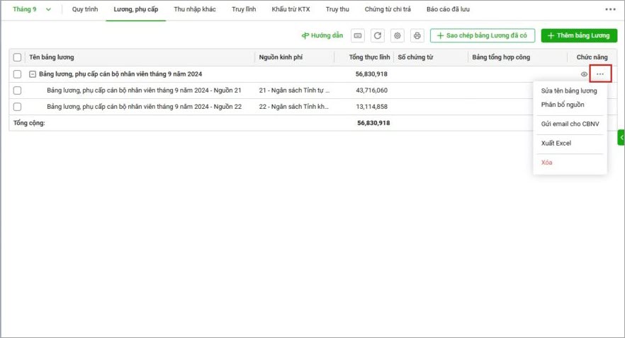Sau khi lập xong bảng thu nhập khác tại màn hình danh sách bảng lương phụ cấp, anh/chị có thể thực hiện: