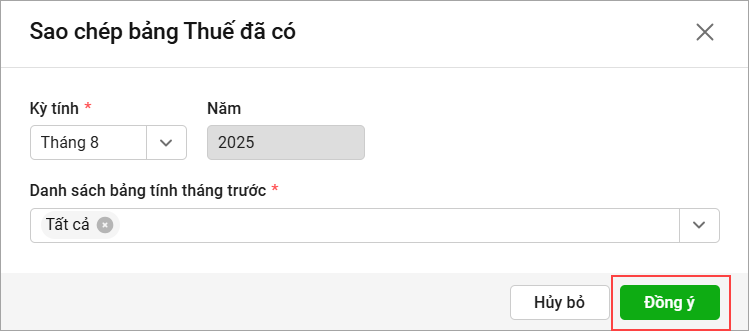 - Kỳ tính: Phần mềm mặc định là tháng hiện tại, có thể thay đổi nếu muốn lập bảng thuế cho tháng khác