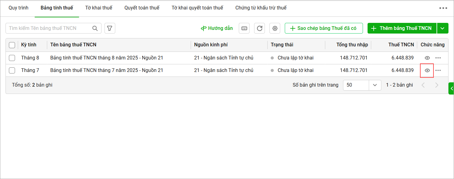 1. Nếu anh/chị có nhu cầu xem lại bảng Thuế TNCN, anh/chị chọn biểu tượng con mắt