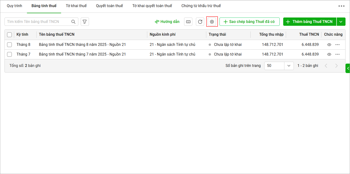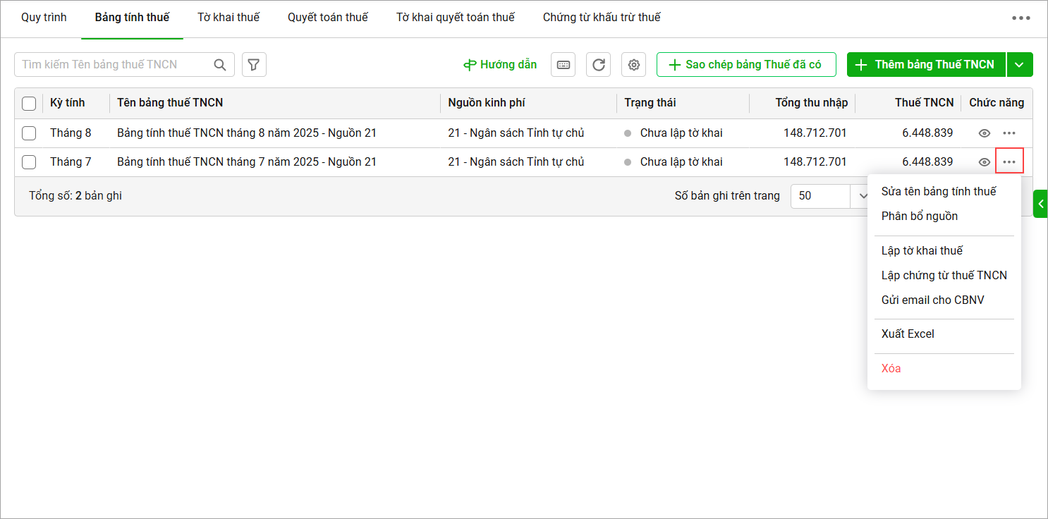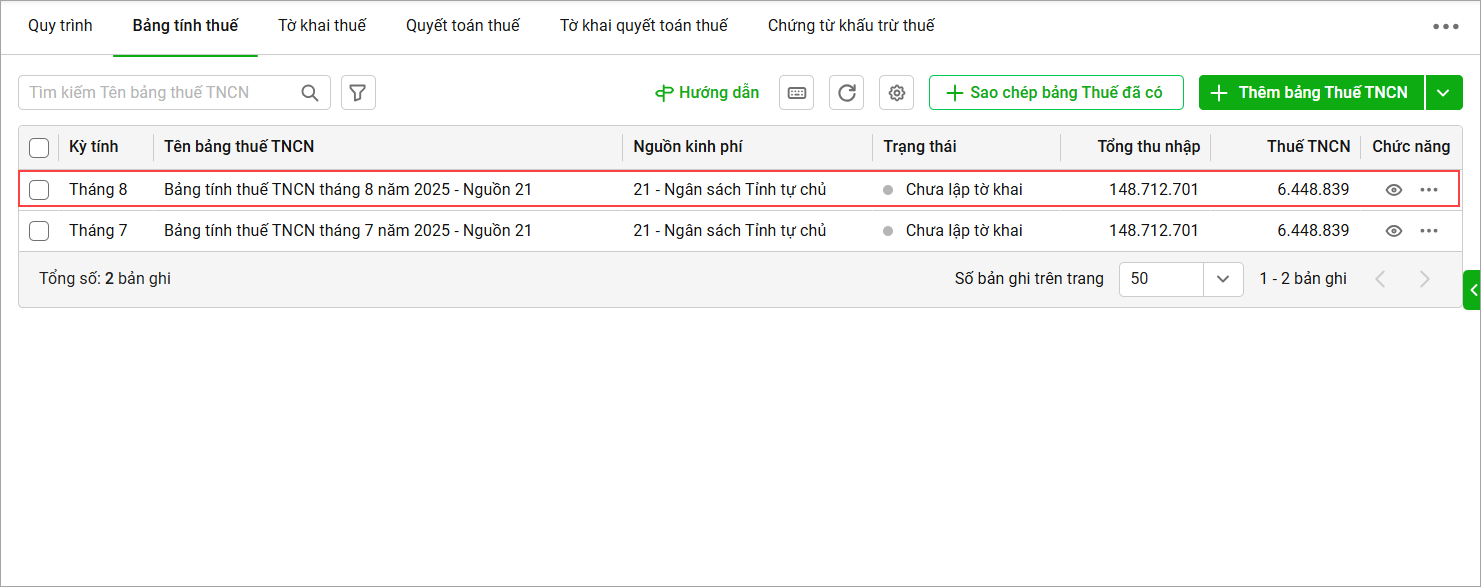 3. Sau khi lập xong bảng Thuế TNCN, danh sách bảng tính Thuế TNCN sẽ hiển thị tại tại màn hình danh sách