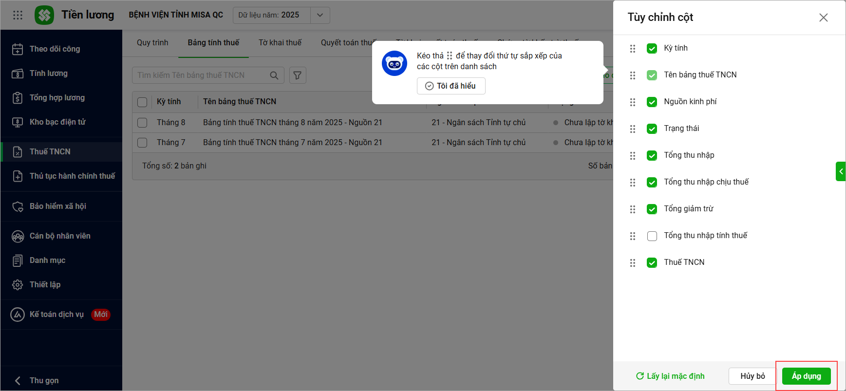 - Tích chọn để hiện và bỏ tích để ẩn cột thông tin, có thể di chuyển lên xuống giữa các cột để tùy chỉnh thứ tự các cột. Sau đó chọn Áp dụng