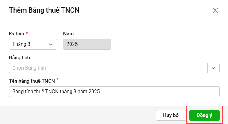 - Bảng tính: Chọn bảng tính để làm căn cứ tính thuế TNCN