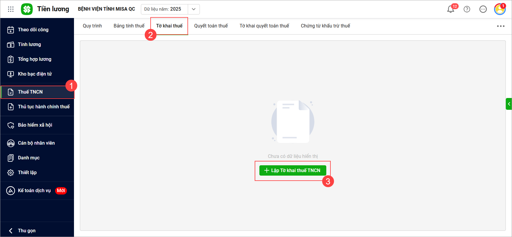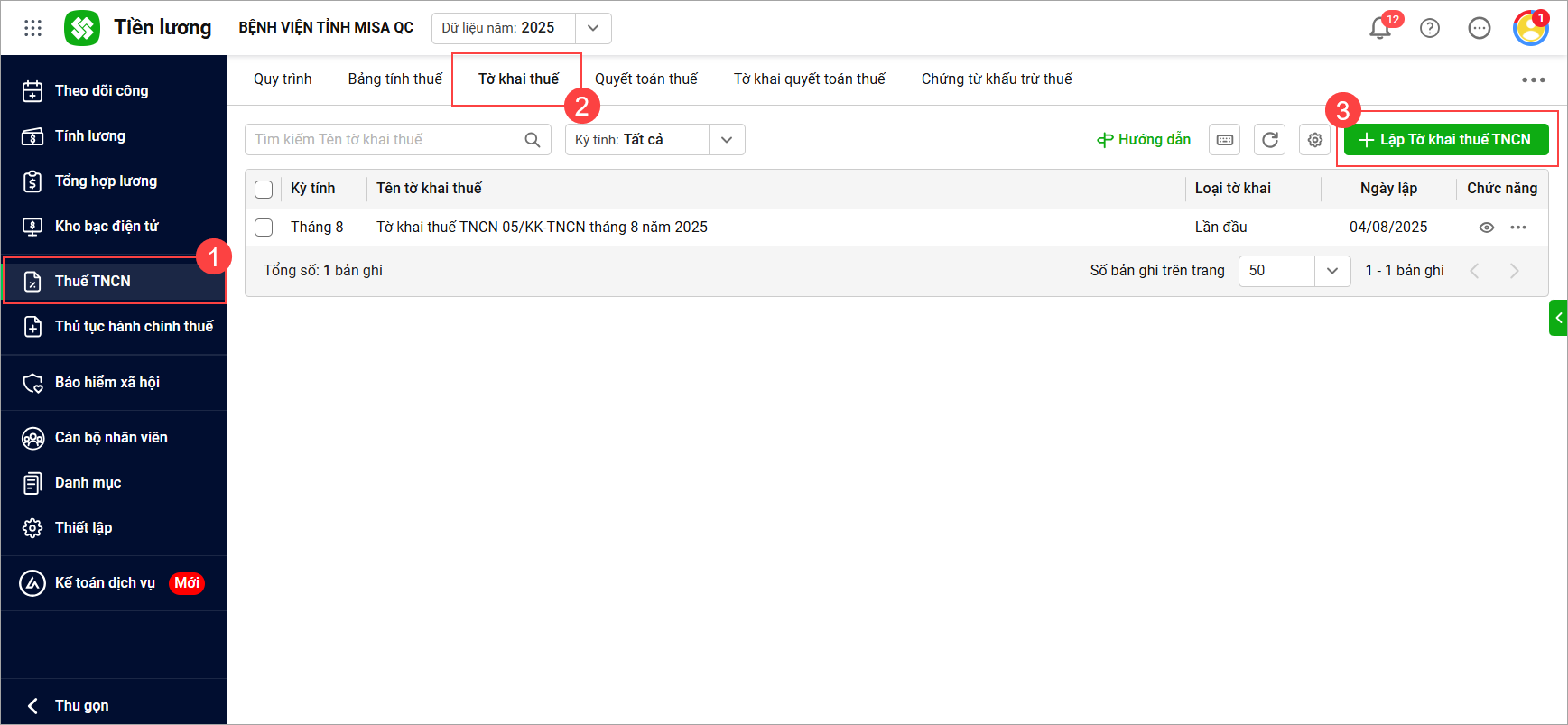 1. Vào menu Thuế TNCN\Tờ khai thuế\Lập Tờ khai thuế TNCN