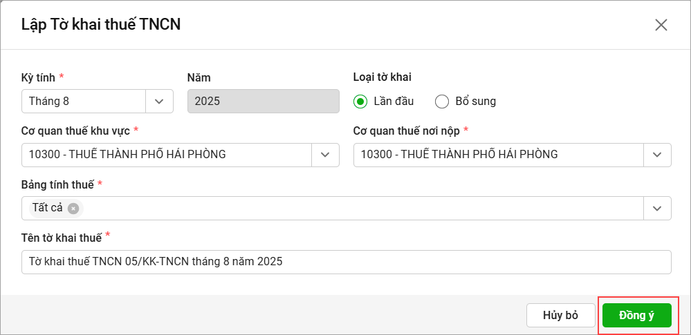 - Kỳ tính: Tùy thuộc đơn vị muốn lập tờ khai theo tháng hoặc quý để chọn kỳ tính tương ứng