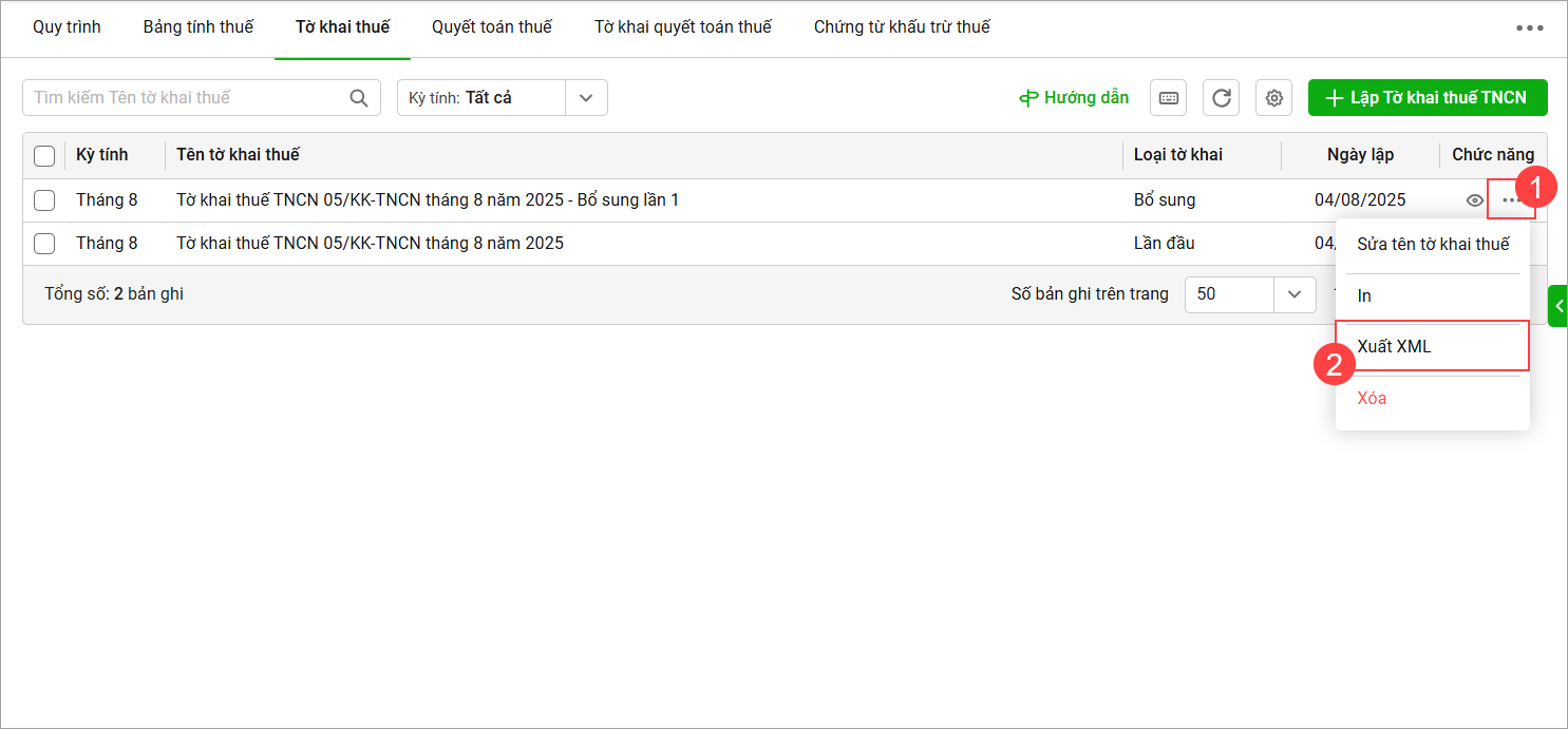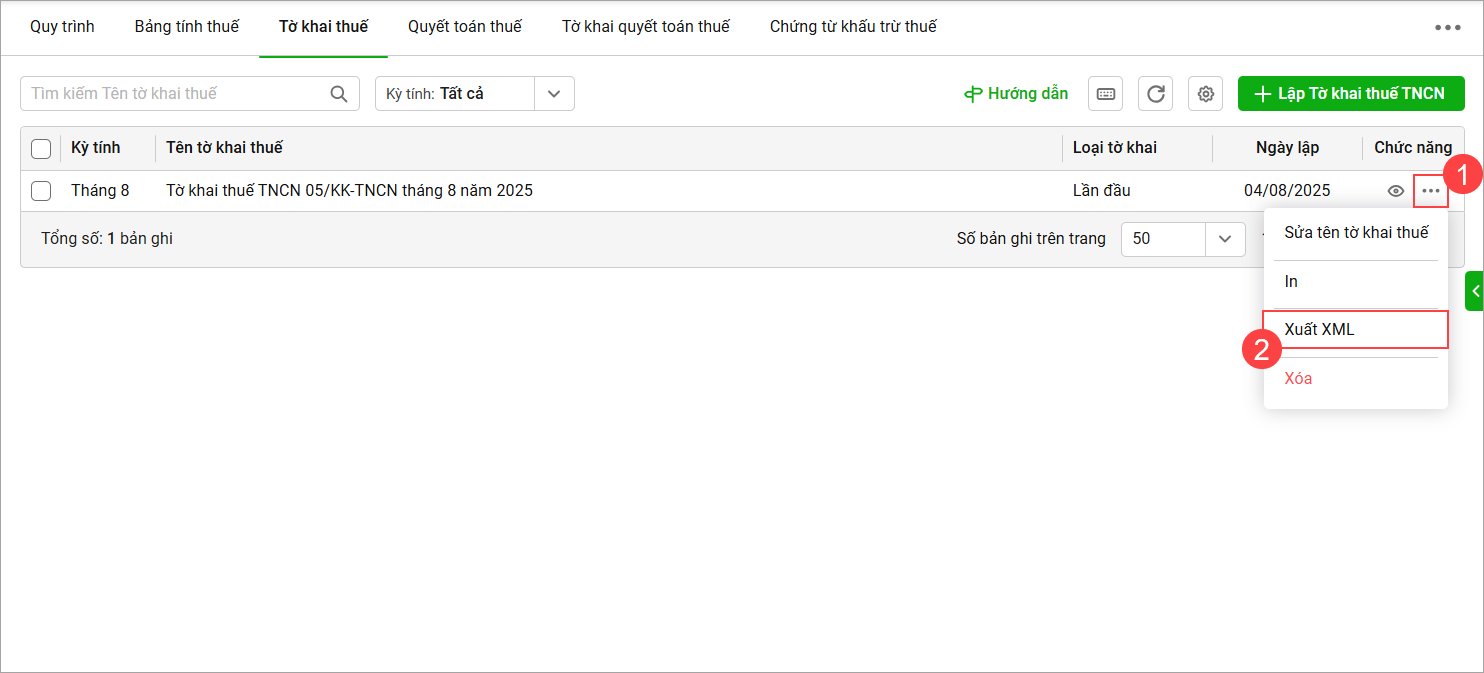 Hoặc tại danh sách tờ khai thuế TNCN anh/chị chọn biểu tượng…, chọn Xuất XML