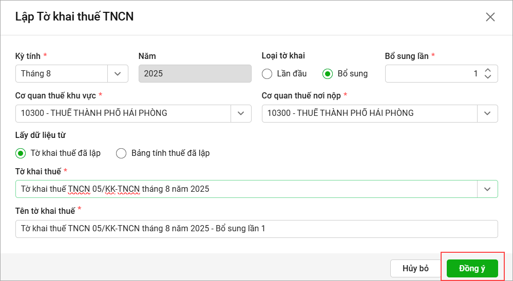 3. Phần mềm sẽ lập tờ khai bổ sung mẫu 05/KK-TNCN theo quy định của Bộ Tài chính