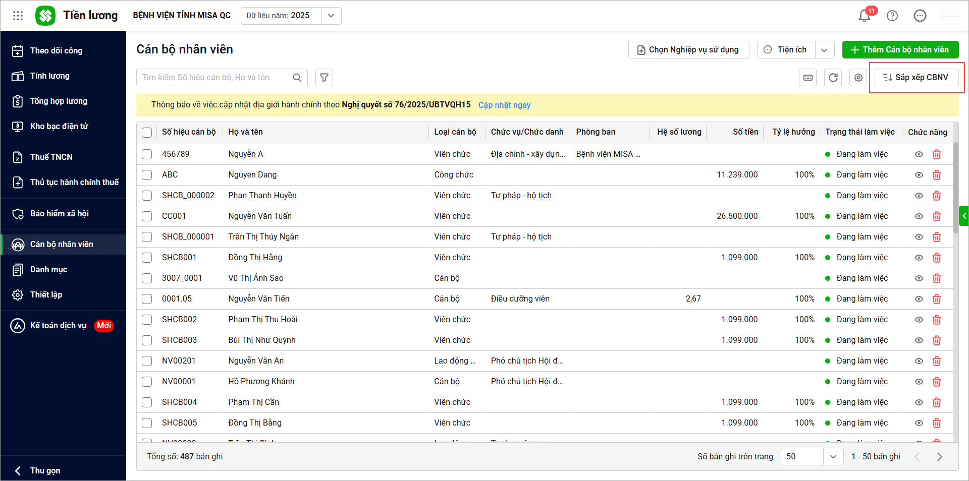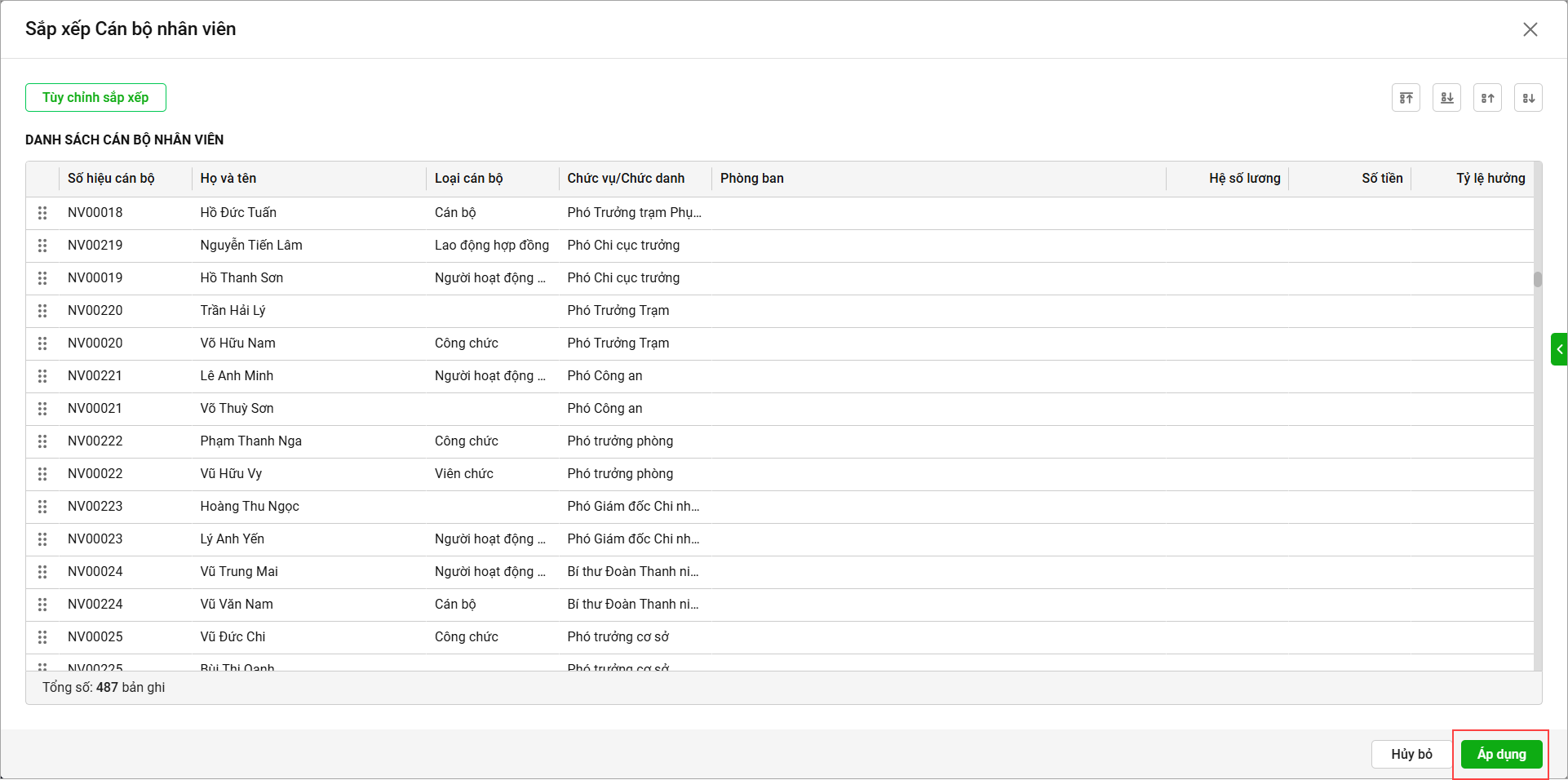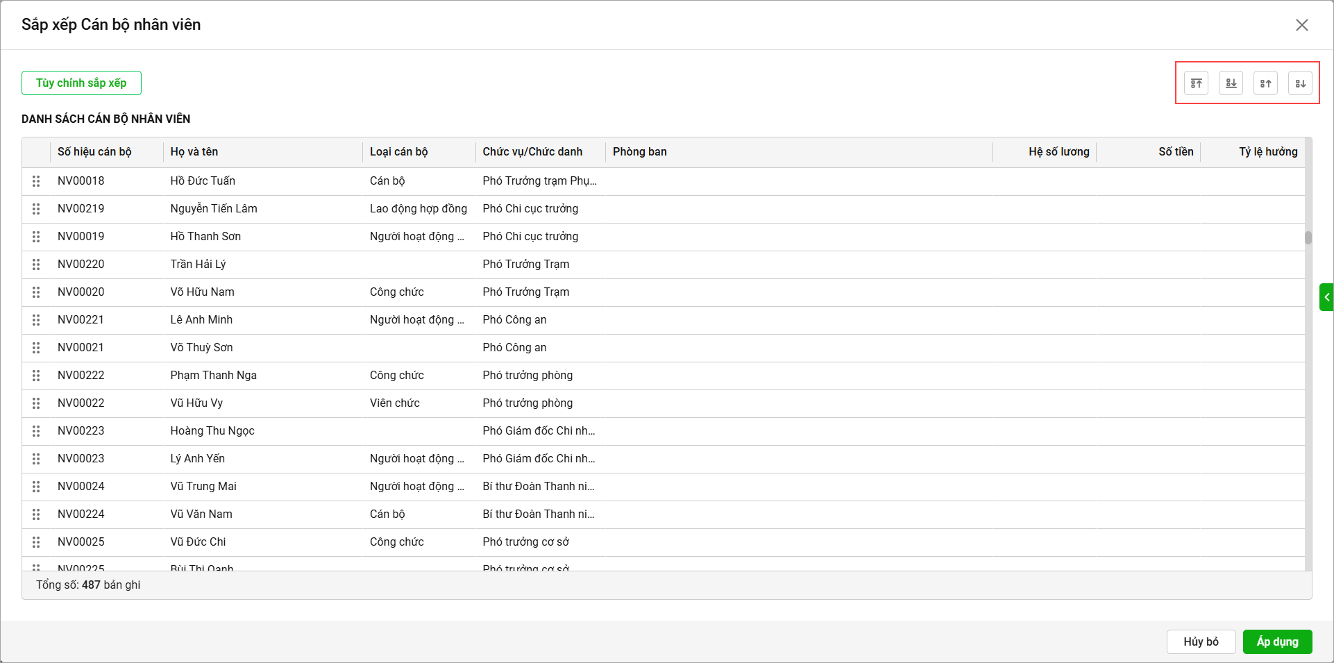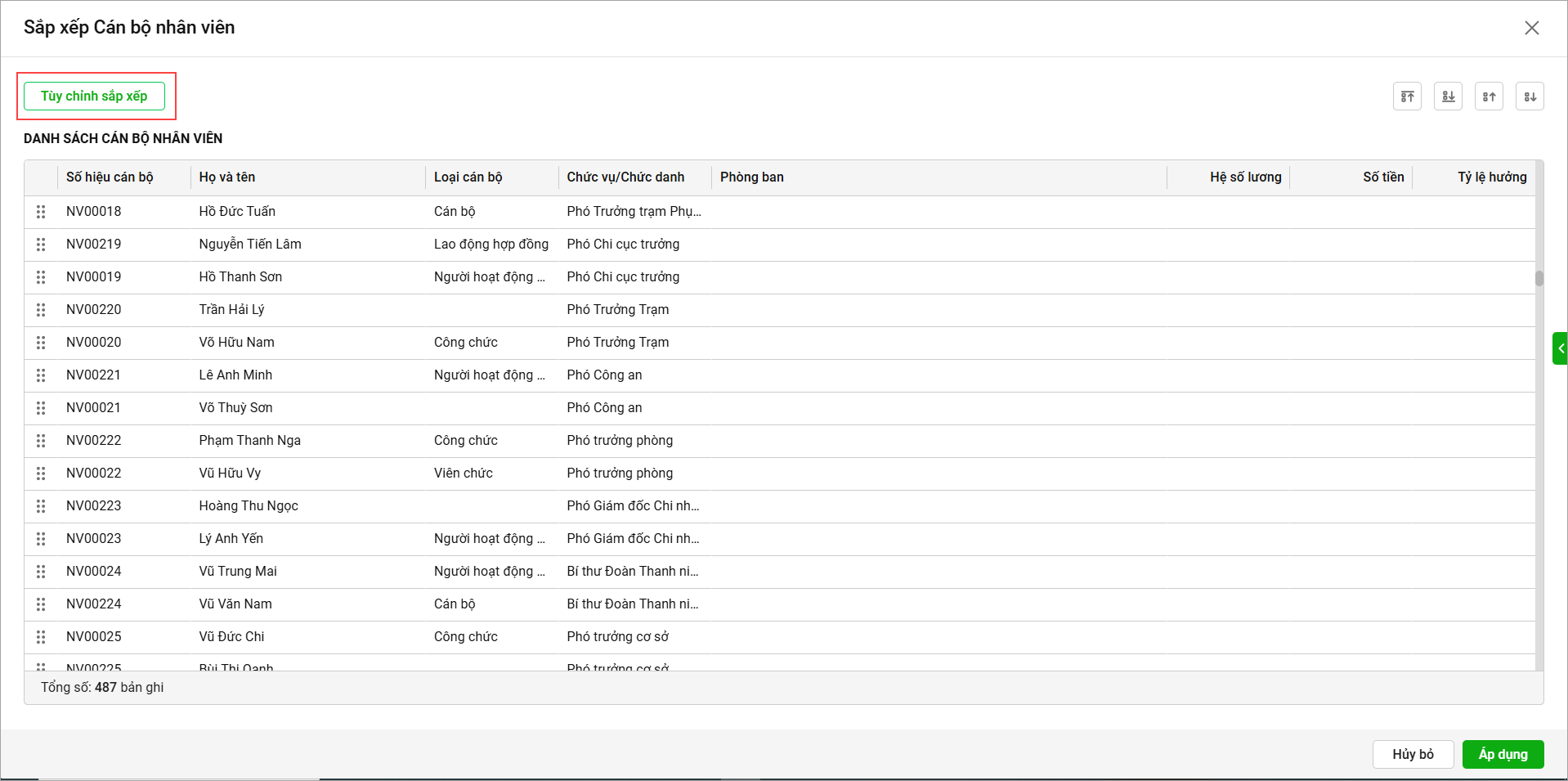 - Để sắp xếp 1 CBNV cụ thể anh/chị chọn CBNV đó, sau đó chọn tiêu chí sắp xếp