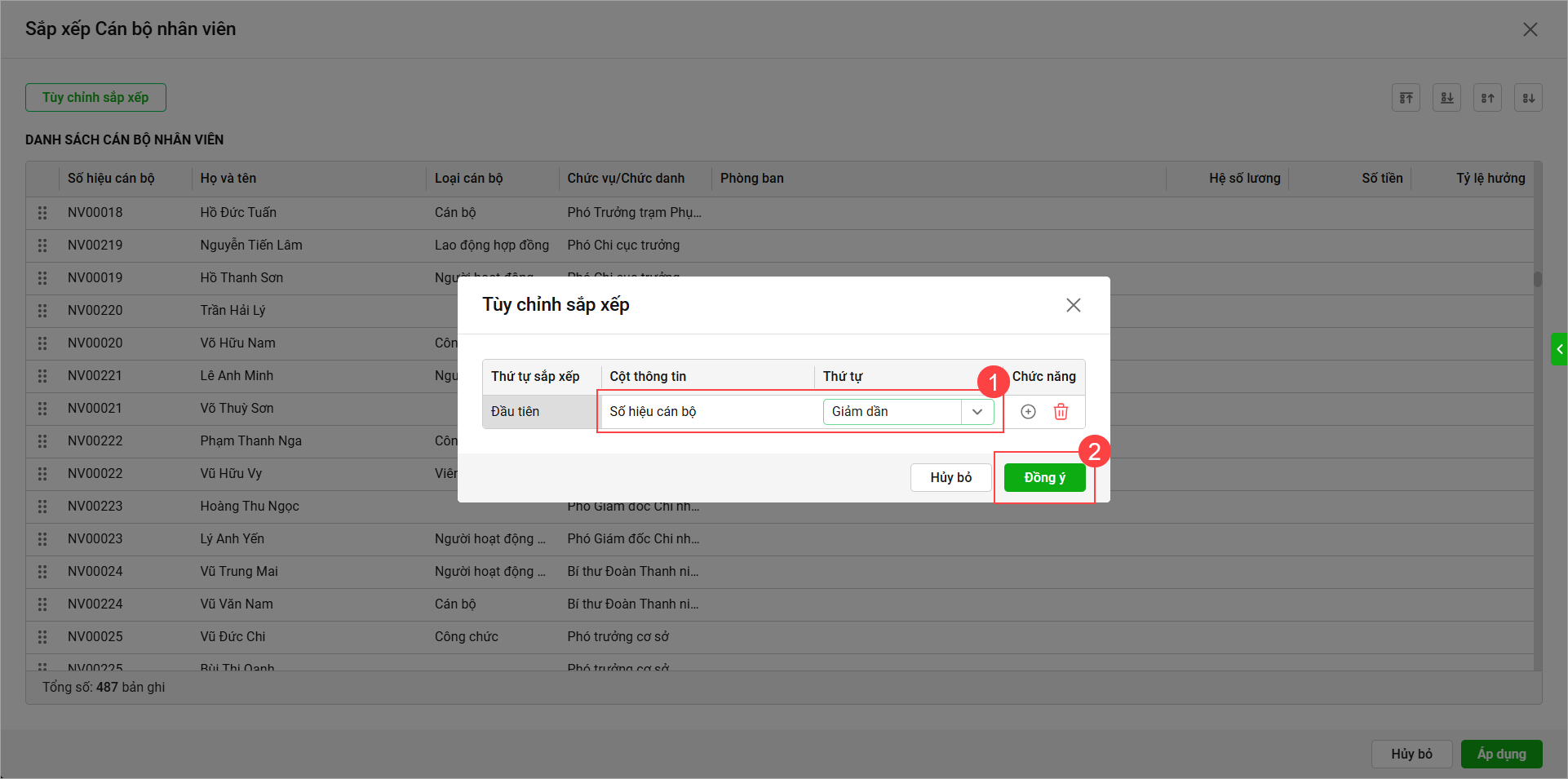 - Chọn cột thông tin sắp xếp CBNV và chọn thứ tự sắp xếp tương ứng, sau đó chọn Đồng ý